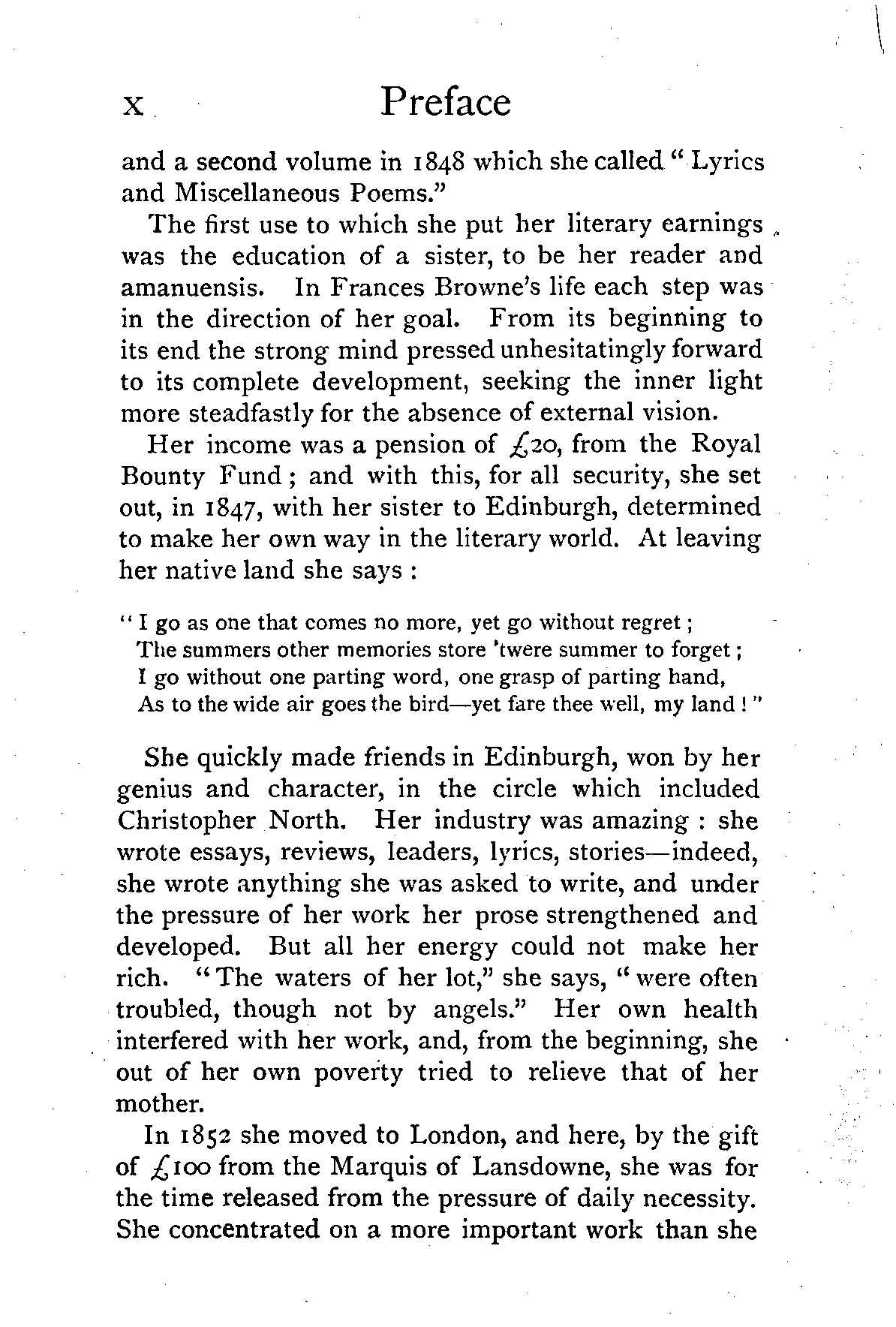 Her income was a pension of £20, from the Royal Bounty Fund; and with this, for all security, she set out, in 1847, with her sister to Edinburgh, determined to make her own way in the literary world. At leaving her native land she says: