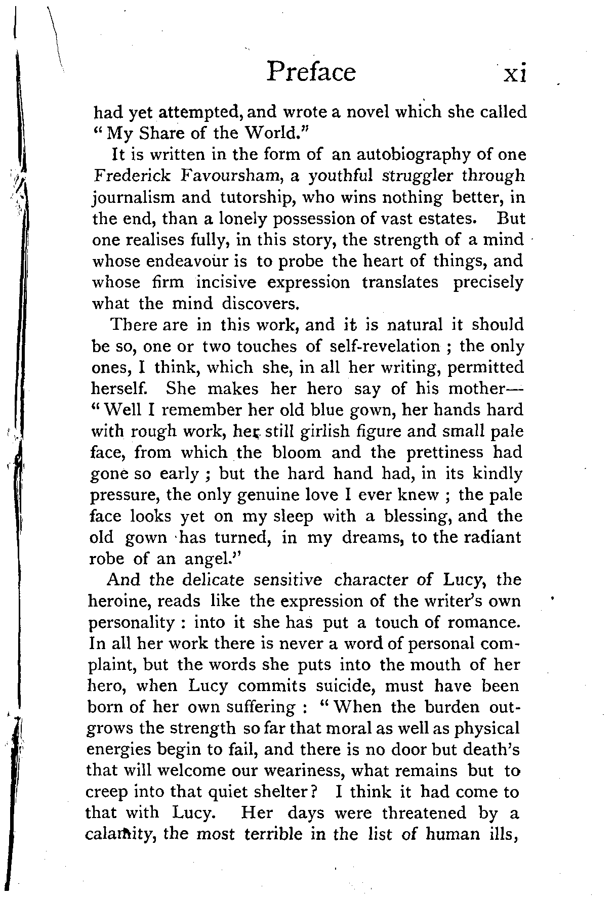 And the delicate sensitive character of Lucy, the heroine, reads like the expression of the writer's own personality: into it she has put a touch of romance. In all her work there is never a word of personal complaint, but the words she puts into the mouth of her hero, when Lucy commits suicide, must have been born of her own suffering: "When the burden outgrows the strength so far that moral as well as physical energies begin to fail, and there is no door but death's that will welcome our weariness, what remains but to creep into that quiet shelter? I think it had come to that with Lucy. Her days were threatened by a calamity, the most terrible in the list of human ills, [Pg xii] which the wise Manetho, the last of the Egyptians, with his brave Pagan heart and large philosophy, thought good and sufficient warrant for a man's resigning his place on the earth."