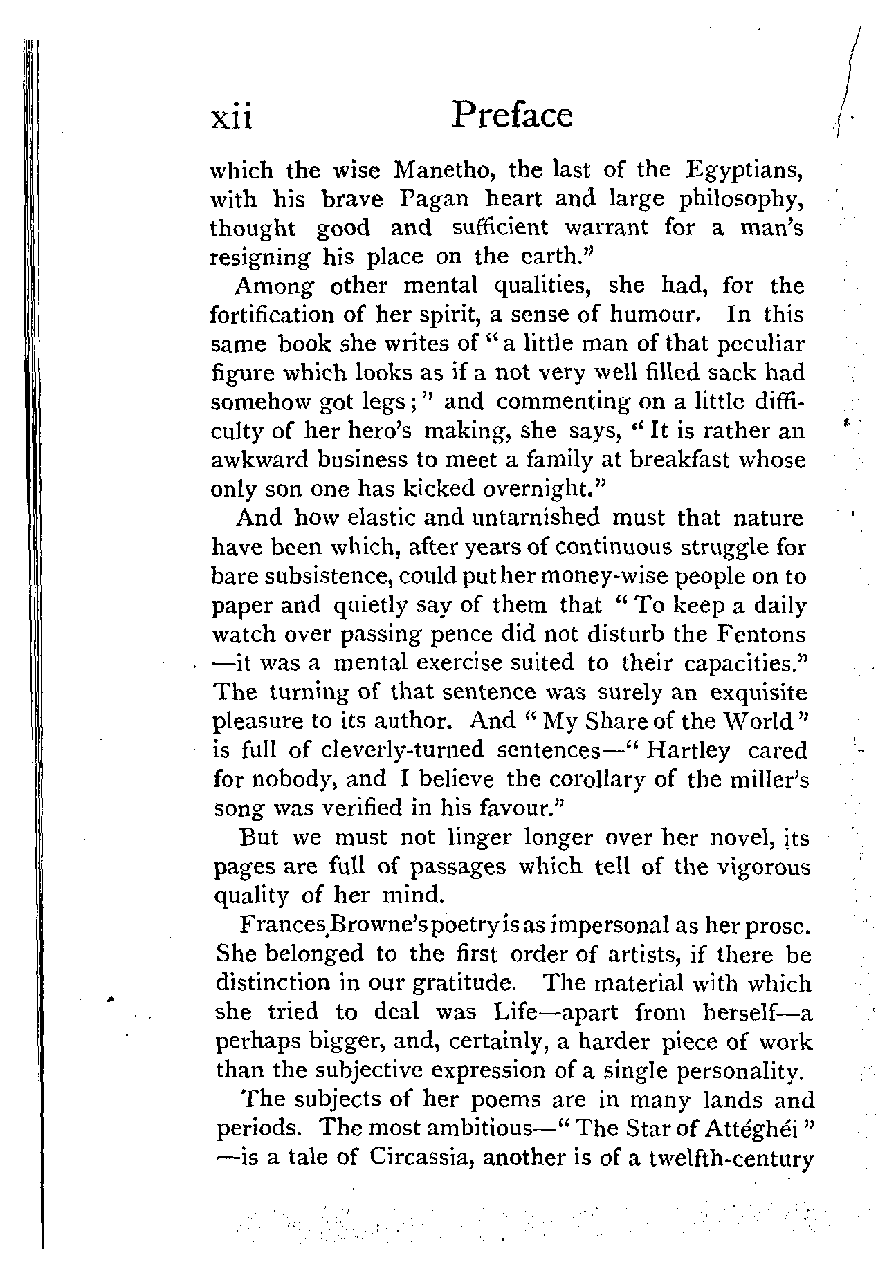 Frances Browne's poetry is as impersonal as her prose. She belonged to the first order of artists, if there be distinction in our gratitude. The material with which she tried to deal was Life—apart from herself—a perhaps bigger, and, certainly, a harder piece of work than the subjective expression of a single personality.