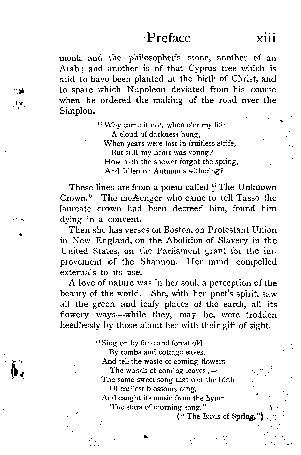 The subjects of her poems are in many lands and periods. The most ambitious—"The Star of Attéghéi"—is a tale of Circassia, another is of a twelfth-century [Pg xiii] monk and the philosopher's stone, another of an Arab; and another is of that Cyprus tree which is said to have been planted at the birth of Christ, and to spare which Napoleon deviated from his course when he ordered the making of the road over the Simplon.