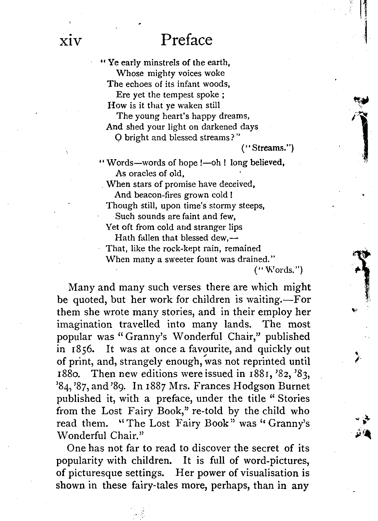 Many and many such verses there are which might be quoted, but her work for children is waiting.—For them she wrote many stories, and in their employ her imagination travelled into many lands. The most popular was "Granny's Wonderful Chair," published in 1856. It was at once a favourite, and quickly out of print, and, strangely enough, was not reprinted until 1880. Then new editions were issued in 1881, '82, '83, '84, '87, and '89. In 1887 Mrs. Frances Hodgson Burnet published it, with a preface, under the title "Stories from the Lost Fairy Book," re-told by the child who read them. "The Lost Fairy Book" was "Granny's Wonderful Chair."