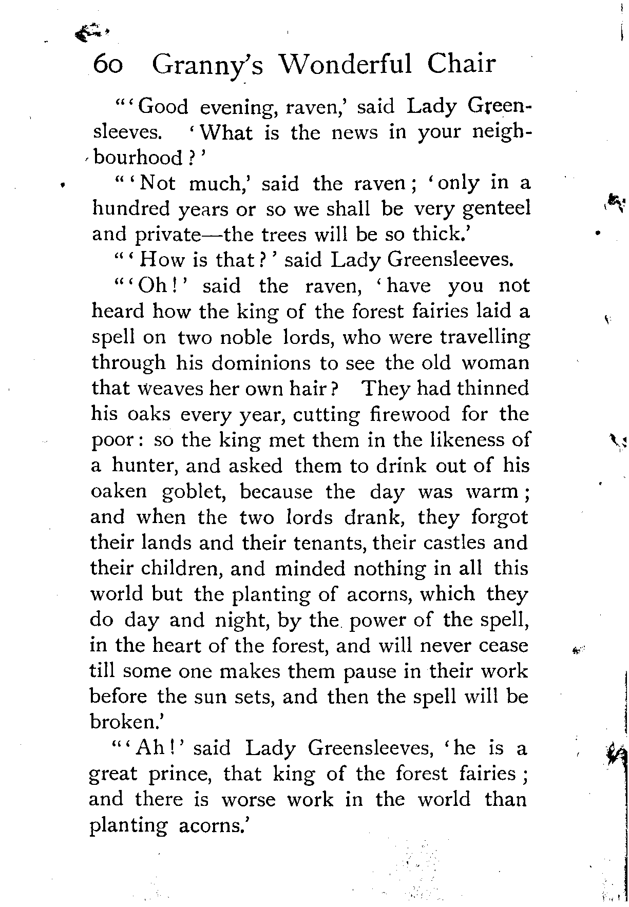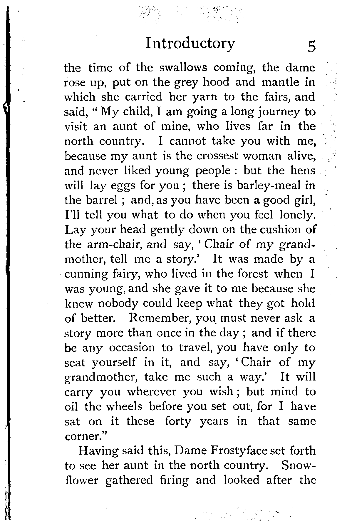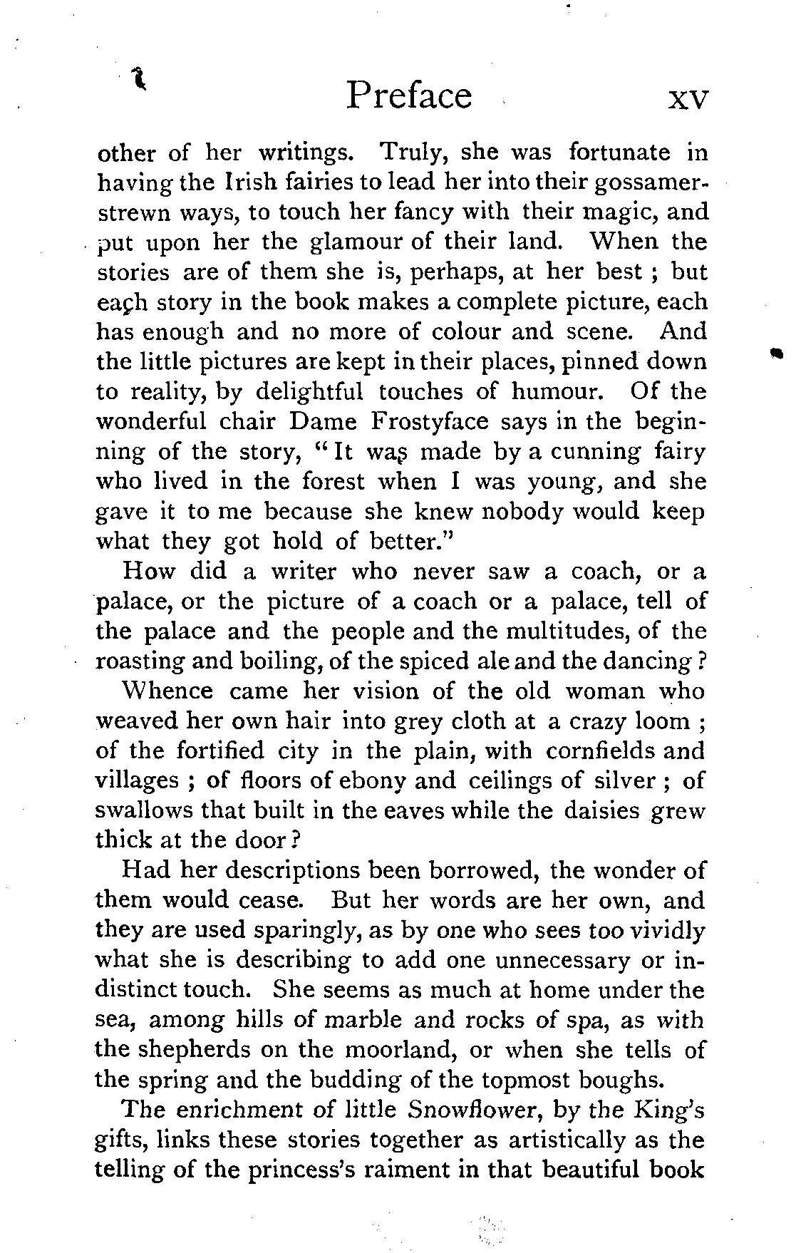 One has not far to read to discover the secret of its popularity with children. It is full of word-pictures, of picturesque settings. Her power of visualisation is shown in these fairy-tales more, perhaps, than in any [Pg xv] other of her writings. Truly, she was fortunate in having the Irish fairies to lead her into their gossamer-strewn ways, to touch her fancy with their magic, and put upon her the glamour of their land. When the stories are of them she is, perhaps, at her best; but each story in the book makes a complete picture, each has enough and no more of colour and scene. And the little pictures are kept in their places, pinned down to reality, by delightful touches of humour. Of the wonderful chair Dame Frostyface says in the beginning of the story, "It was made by a cunning fairy who lived in the forest when I was young, and she gave it to me because she knew nobody would keep what they got hold of better."