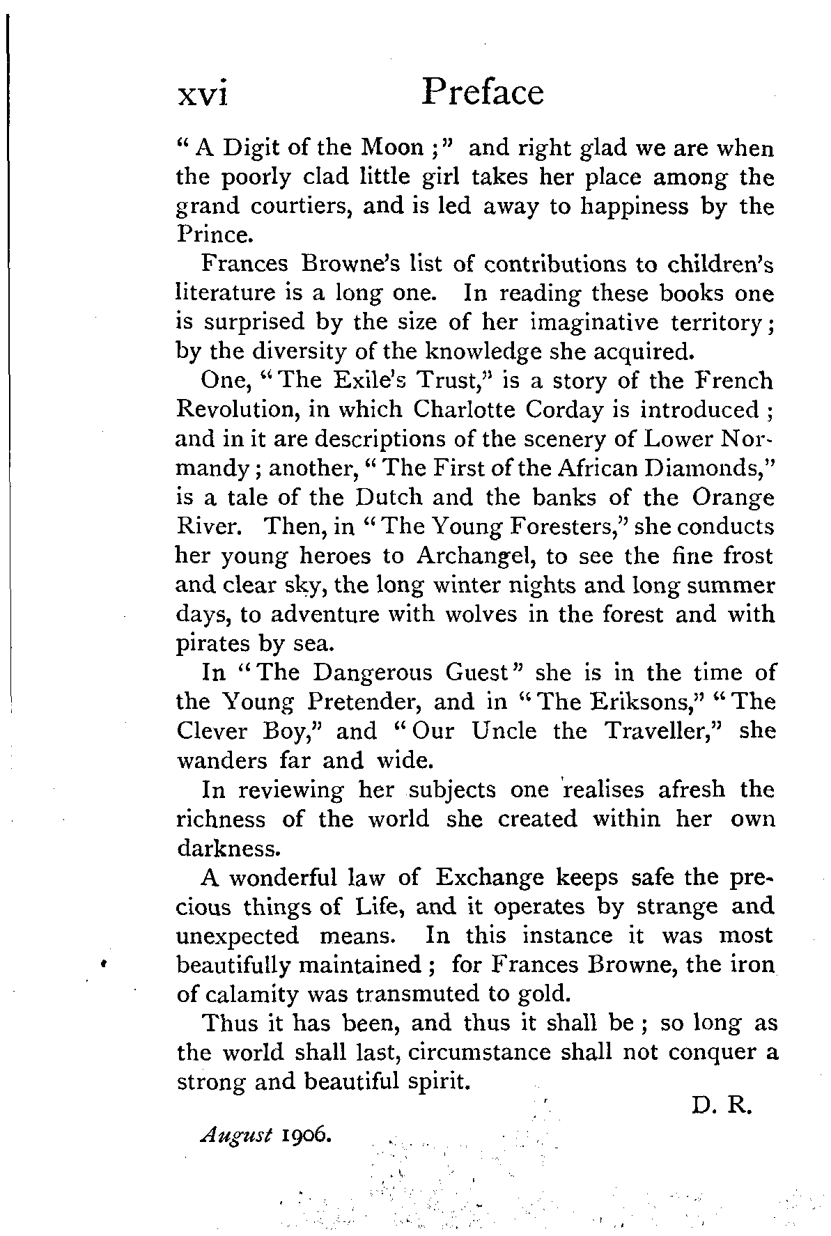 A wonderful law of Exchange keeps safe the precious things of Life, and it operates by strange and unexpected means. In this instance it was most beautifully maintained; for Frances Browne, the iron of calamity was transmuted to gold.