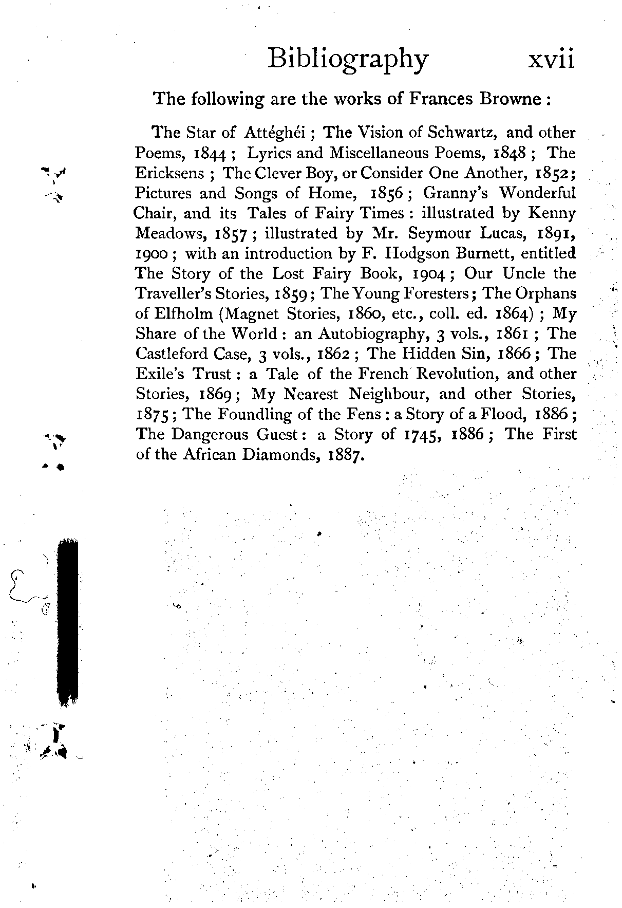 The Star of Attéghéi; The Vision of Schwartz, and other Poems, 1844; Lyrics and Miscellaneous Poems, 1848; The Ericksens; The Clever Boy, or Consider One Another, 1852; Pictures and Songs of Home, 1856; Granny's Wonderful Chair, and its Tales of Fairy Times: illustrated by Kenny Meadows, 1857; illustrated by Mr. Seymour Lucas, 1891, 1900; with an introduction by F. Hodgson Burnett, entitled The Story of the Lost Fairy Book, 1904; Our Uncle the Traveller's Stories, 1859; The Young Foresters; The Orphans of Elfholm (Magnet Stories, 1860, etc., coll. ed. 1864); My Share of the World: an Autobiography, 3 vols., 1861; The Castleford Case, 3 vols., 1862; The Hidden Sin, 1866; The Exile's Trust: a Tale of the French Revolution, and other Stories, 1869; My Nearest Neighbour, and other Stories, 1875; The Foundling of the Fens: a Story of a Flood, 1886; The Dangerous Guest: a Story of 1745, 1886; The First of the African Diamonds, 1887.