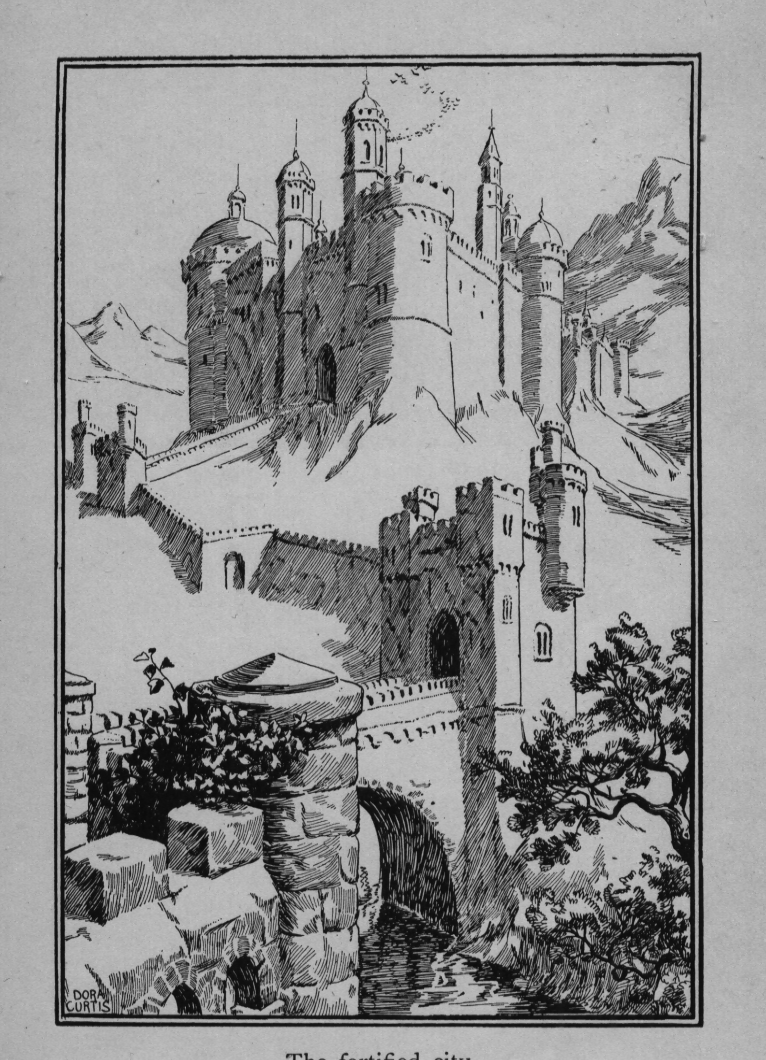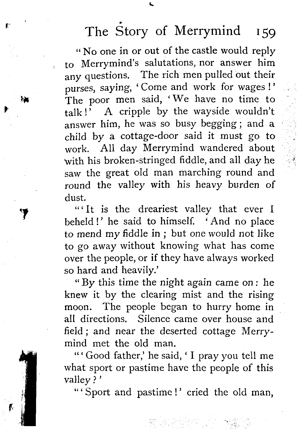 "No one in or out of the castle would reply to Merrymind's salutations, nor answer him any questions. The rich men pulled out their purses, saying, 'Come and work for wages!' The poor men said, 'We have no time to talk!' A cripple by the wayside wouldn't answer him, he was so busy begging; and a child by a cottage-door said it must go to work. All day Merrymind wandered about With his broken-stringed fiddle, and all day he saw the great old man marching round and round the valley with his heavy burden of dust.