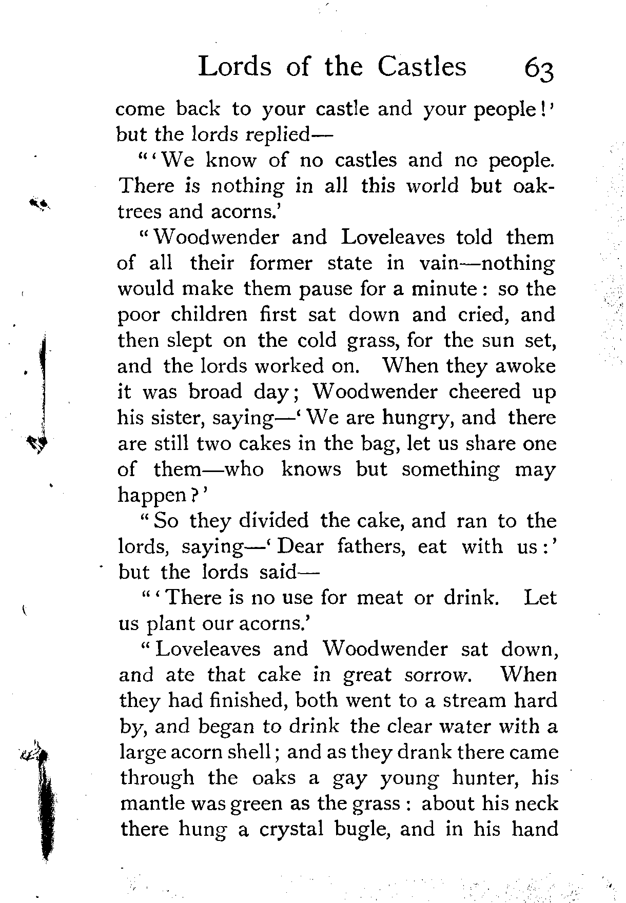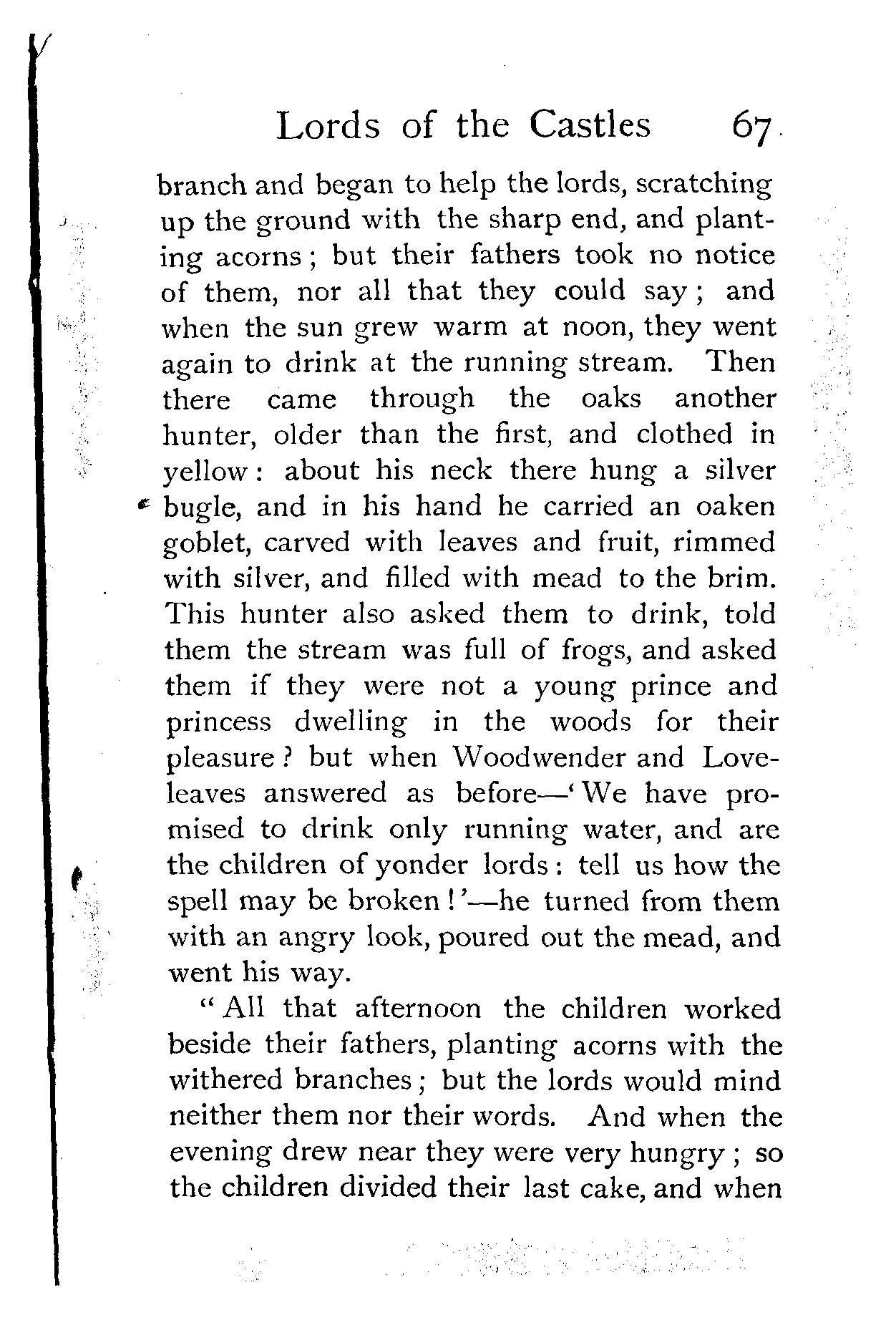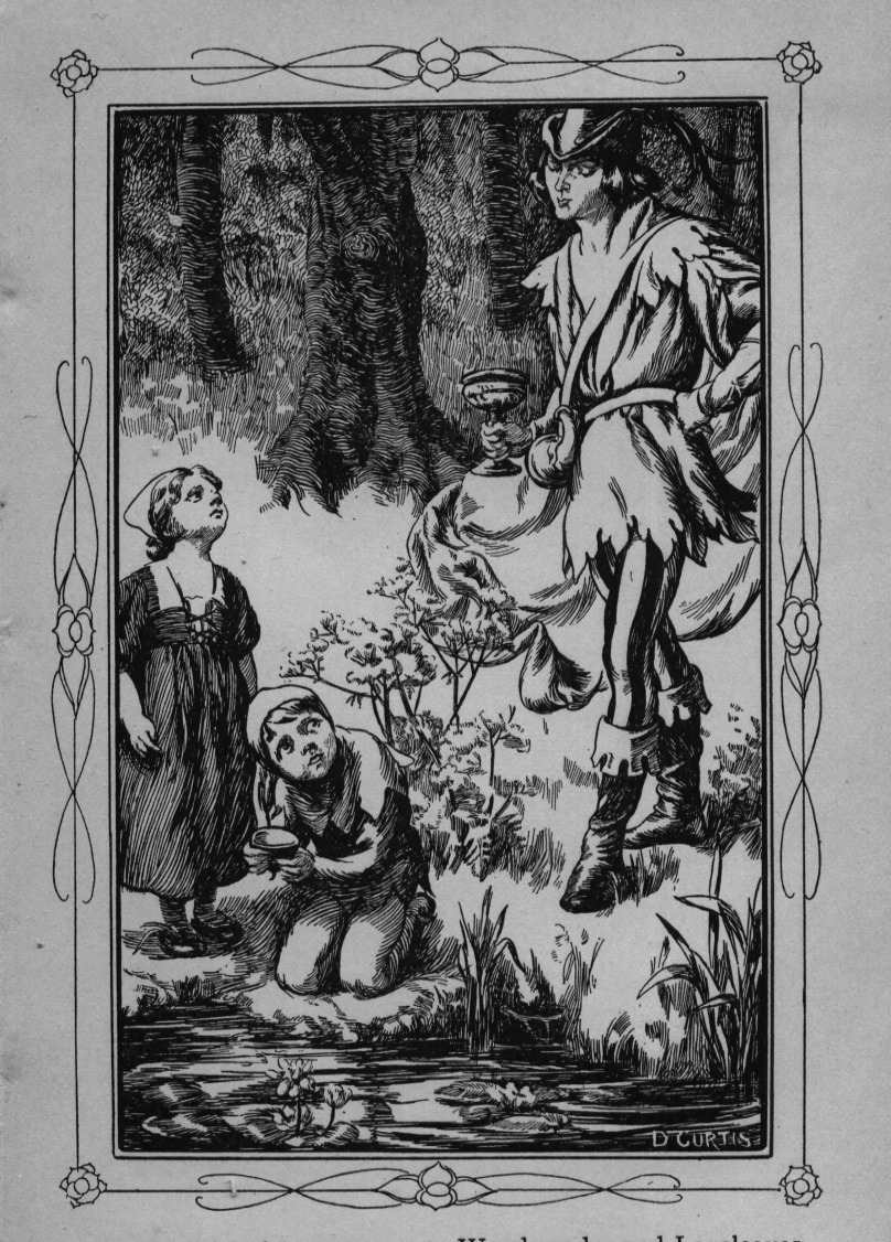 "That night the boy did not sleep so sound: though too drowsy to open his eyes, he was sure there had been singing and spinning near him all night; and, resolving to find out what this meant before he left the valley, Merrymind ate the other half of his barley cake, drank again from the stream, and went out to see the country.