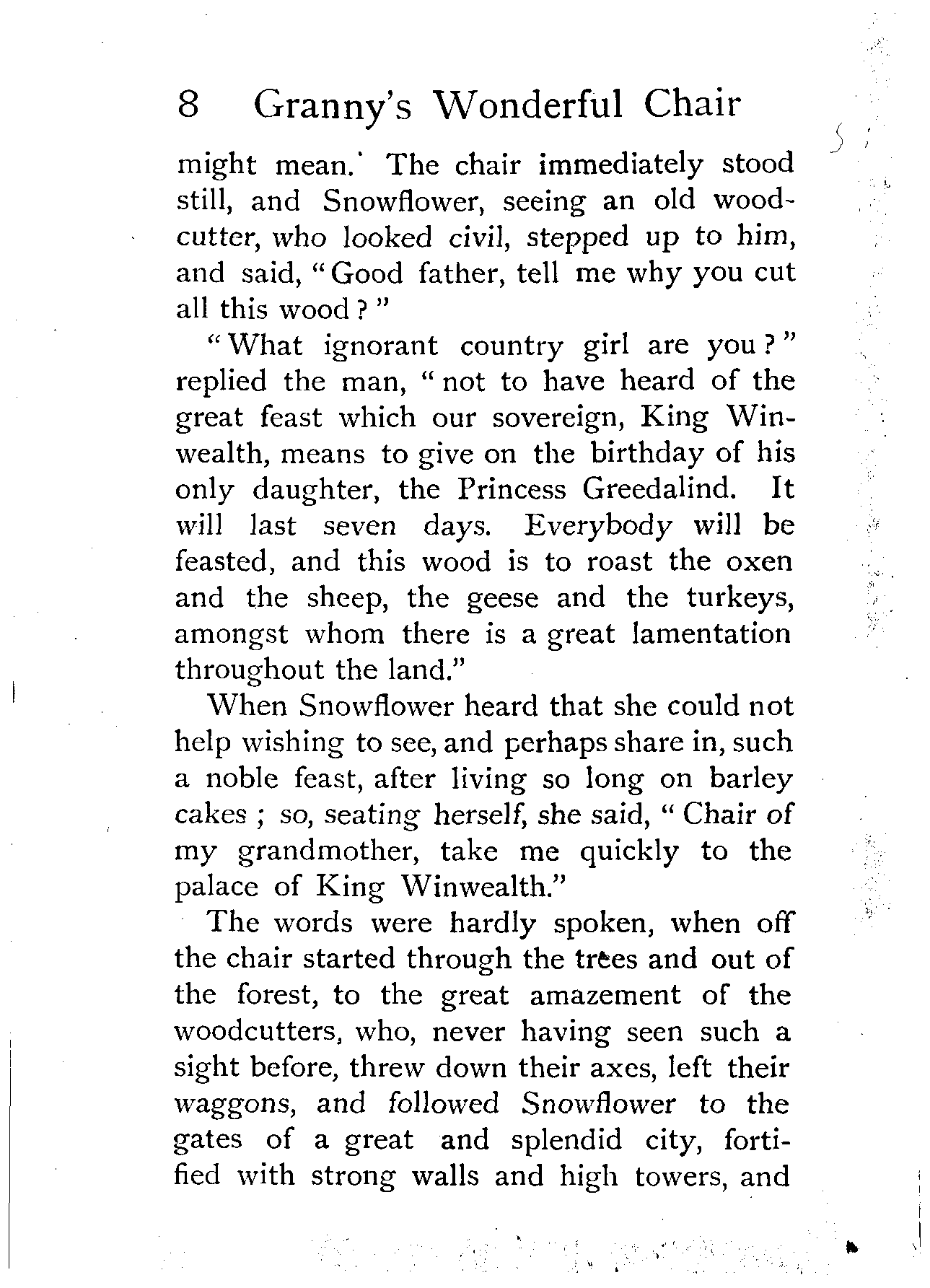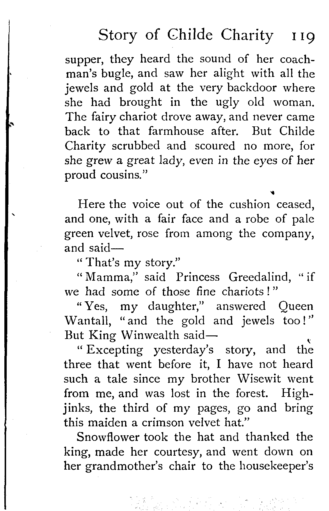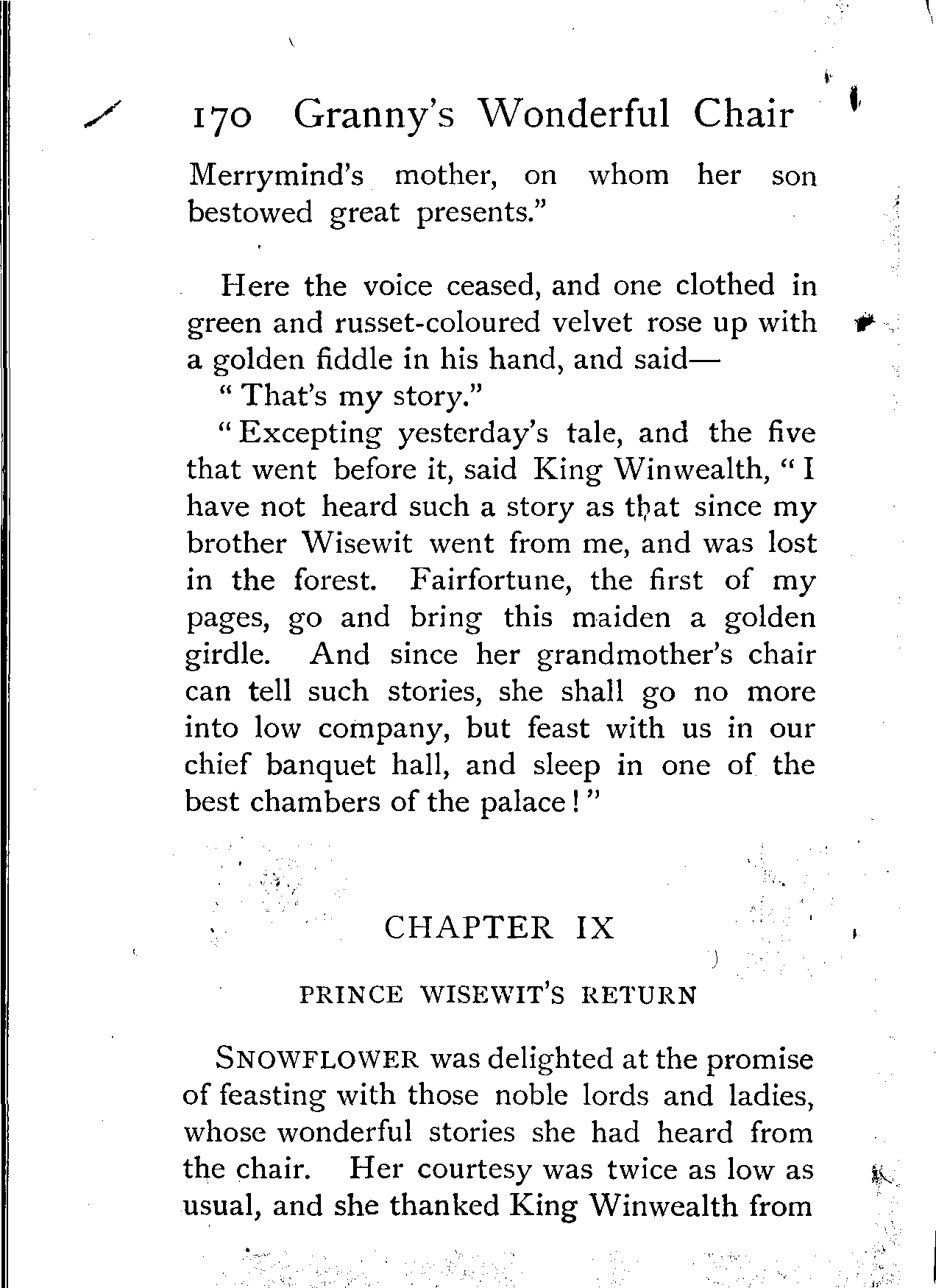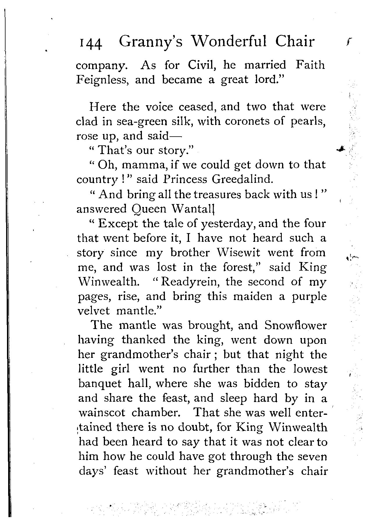 "Excepting yesterday's tale, and the five that went before it," said King Winwealth, "I have not heard such a story as that since my brother Wisewit went from me, and was lost in the forest. Fairfortune, the first of my pages, go and bring this maiden a golden girdle. And since her grandmother's chair can tell such stories, she shall go no more into low company, but feast with us in our chief banquet hall, and sleep in one of the best chambers of the palace!"