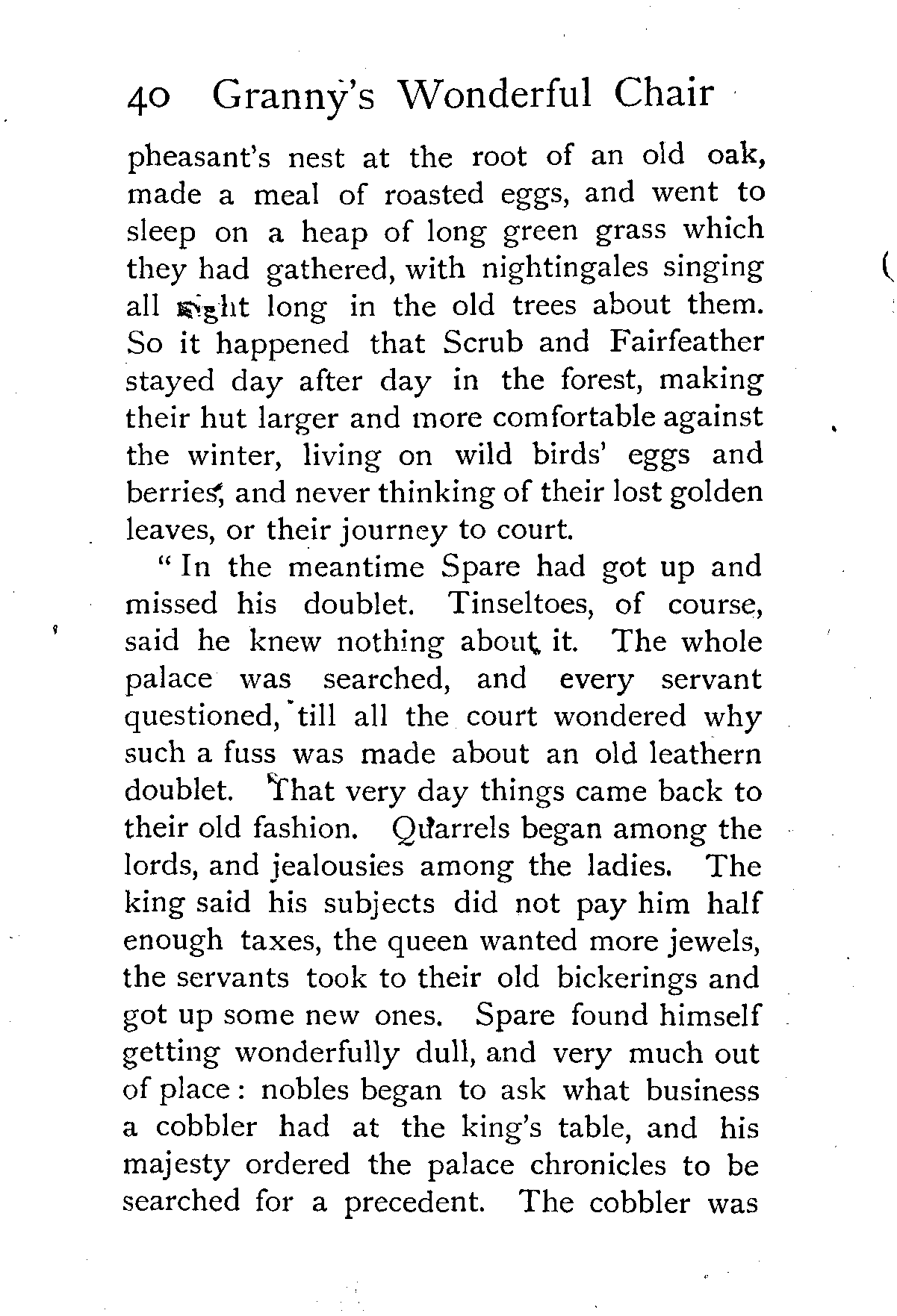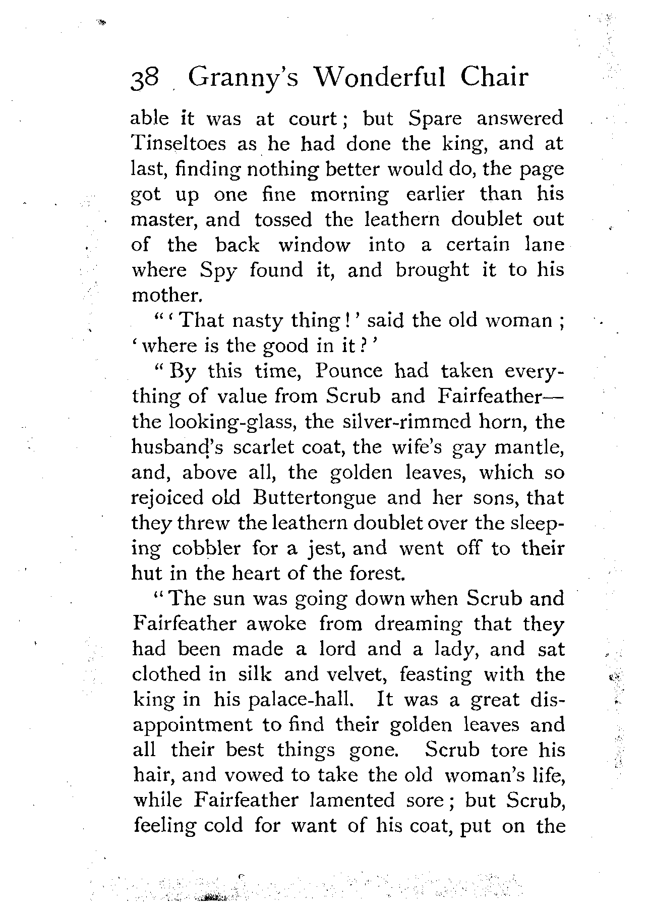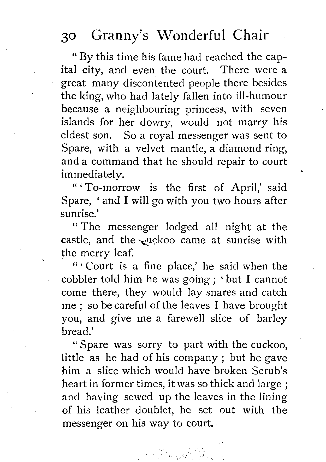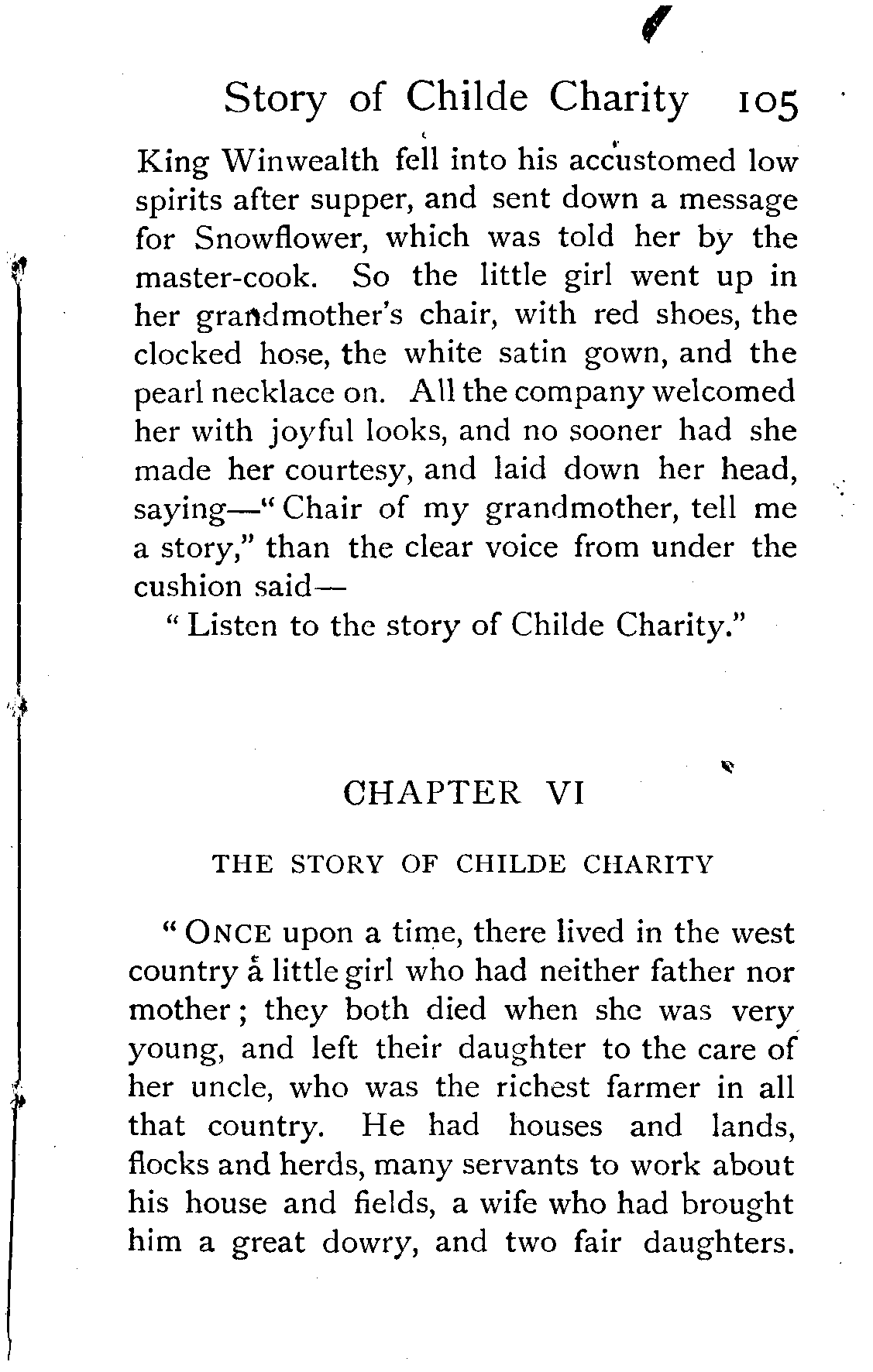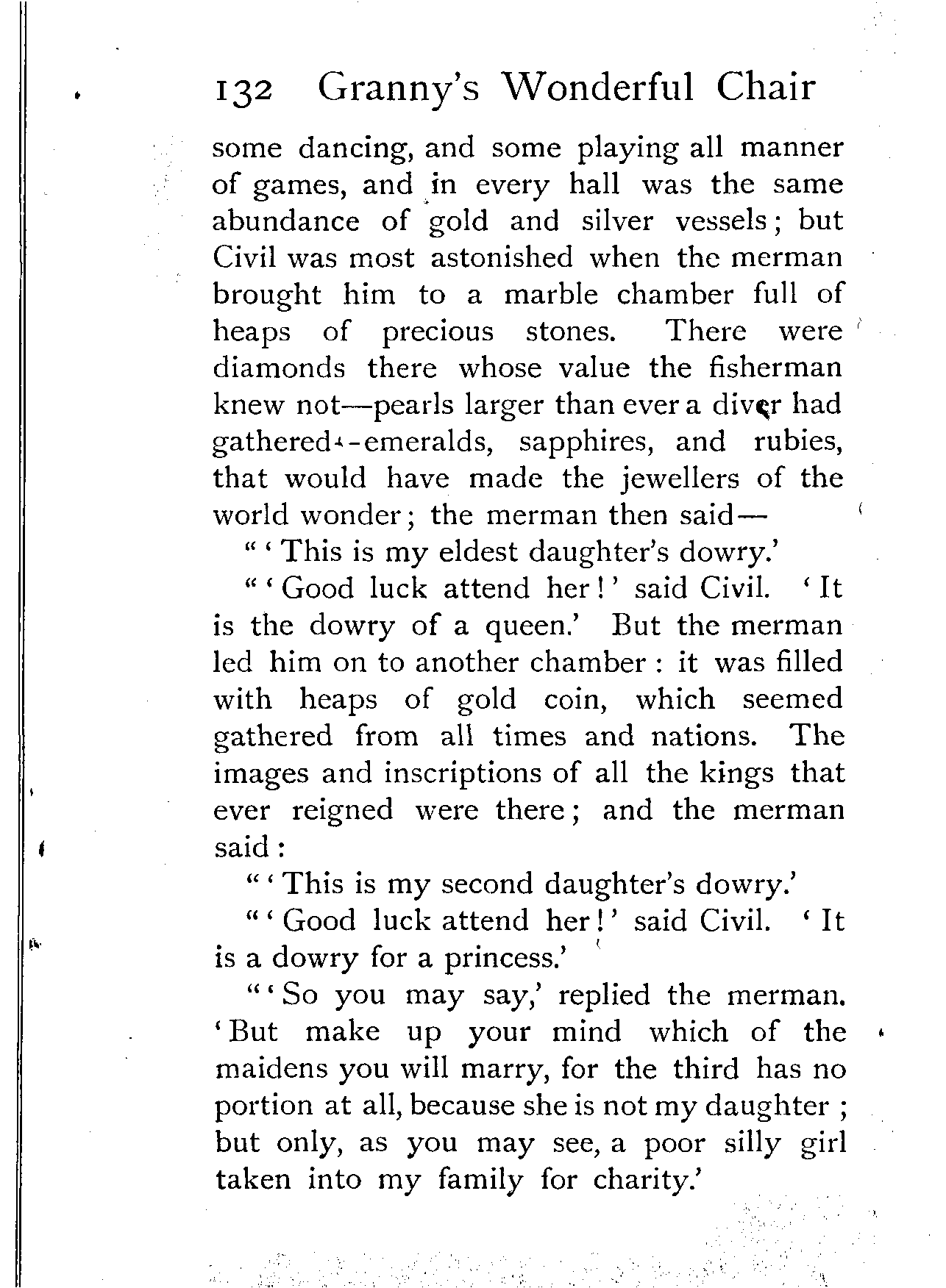 "Excepting yesterday's tale, and the five that went before it," said King Winwealth, "I have not heard such a story as that since my brother Wisewit went from me, and was lost in the forest. Fairfortune, the first of my pages, go and bring this maiden a golden girdle. And since her grandmother's chair can tell such stories, she shall go no more into low company, but feast with us in our chief banquet hall, and sleep in one of the best chambers of the palace!"