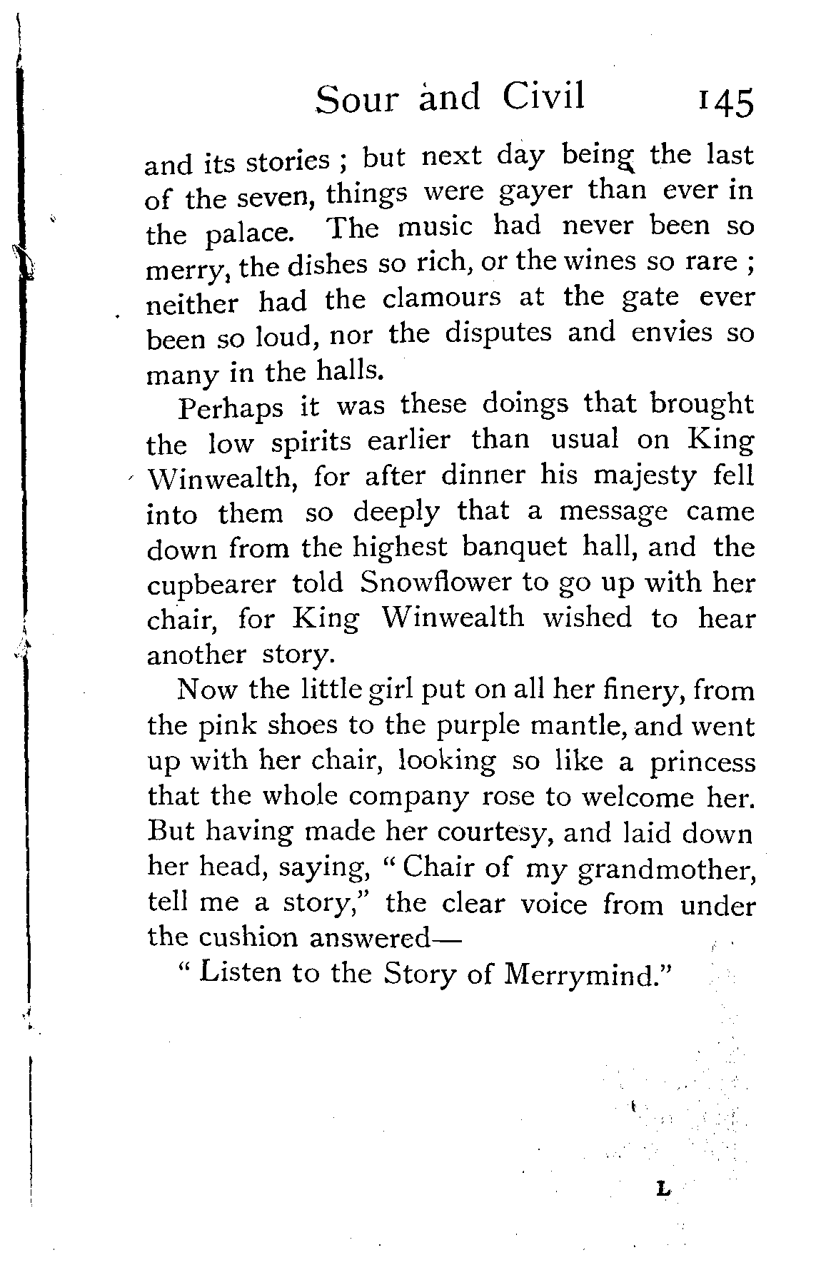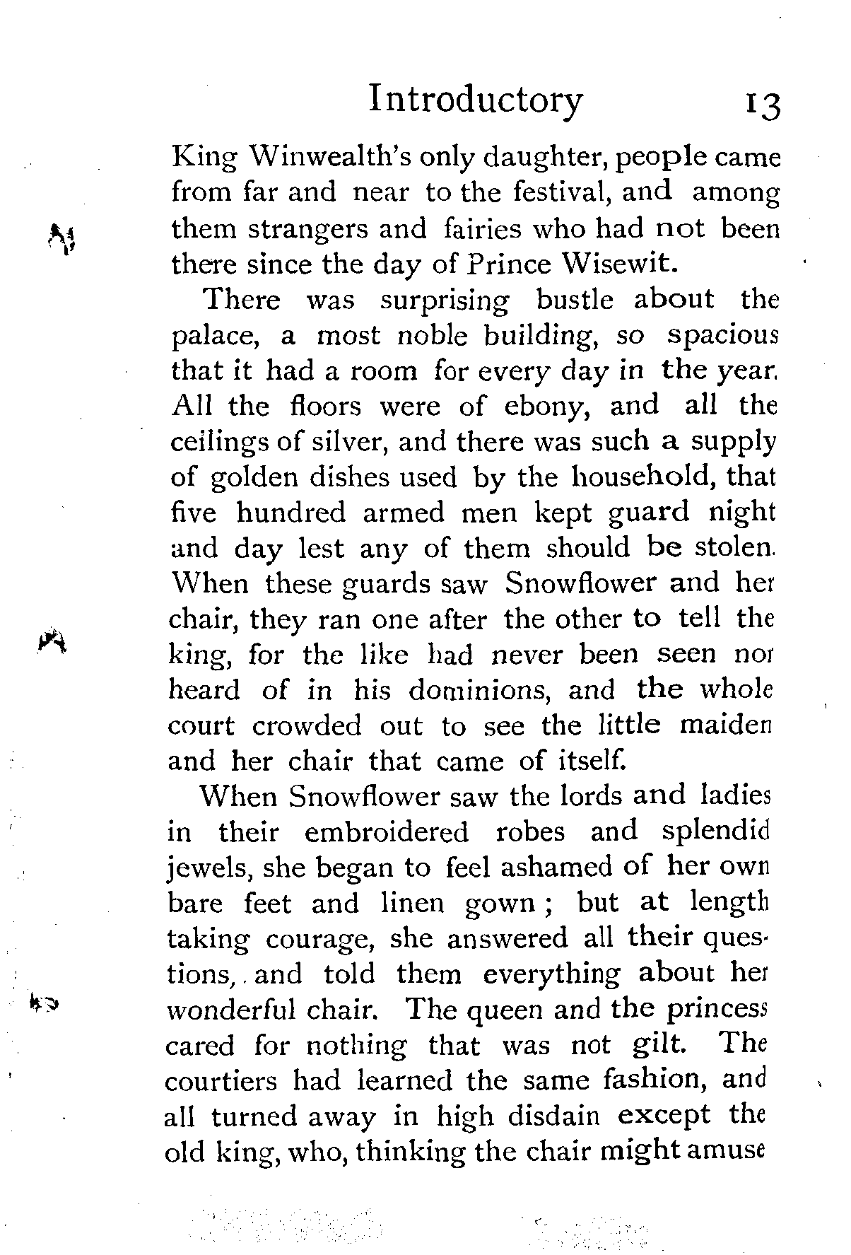 The mantle was brought, and Snowflower having thanked the king, went down upon her grandmother's chair; but that night the little girl went no further than the lowest banquet hall, where she was bidden to stay and share the feast, and sleep hard by in a wainscot chamber. That she was well entertained there is no doubt, for King Winwealth had been heard to say that it was not clear to him how he could have got through the seven days' feast without her grandmother's chair [Pg 145]and its stories; but next day being the last of the seven, things were gayer than ever in the palace. The music had never been so merry, the dishes so rich, or the wines so rare; neither had the clamours at the gate ever been so loud, nor the disputes and envies so many in the halls.
