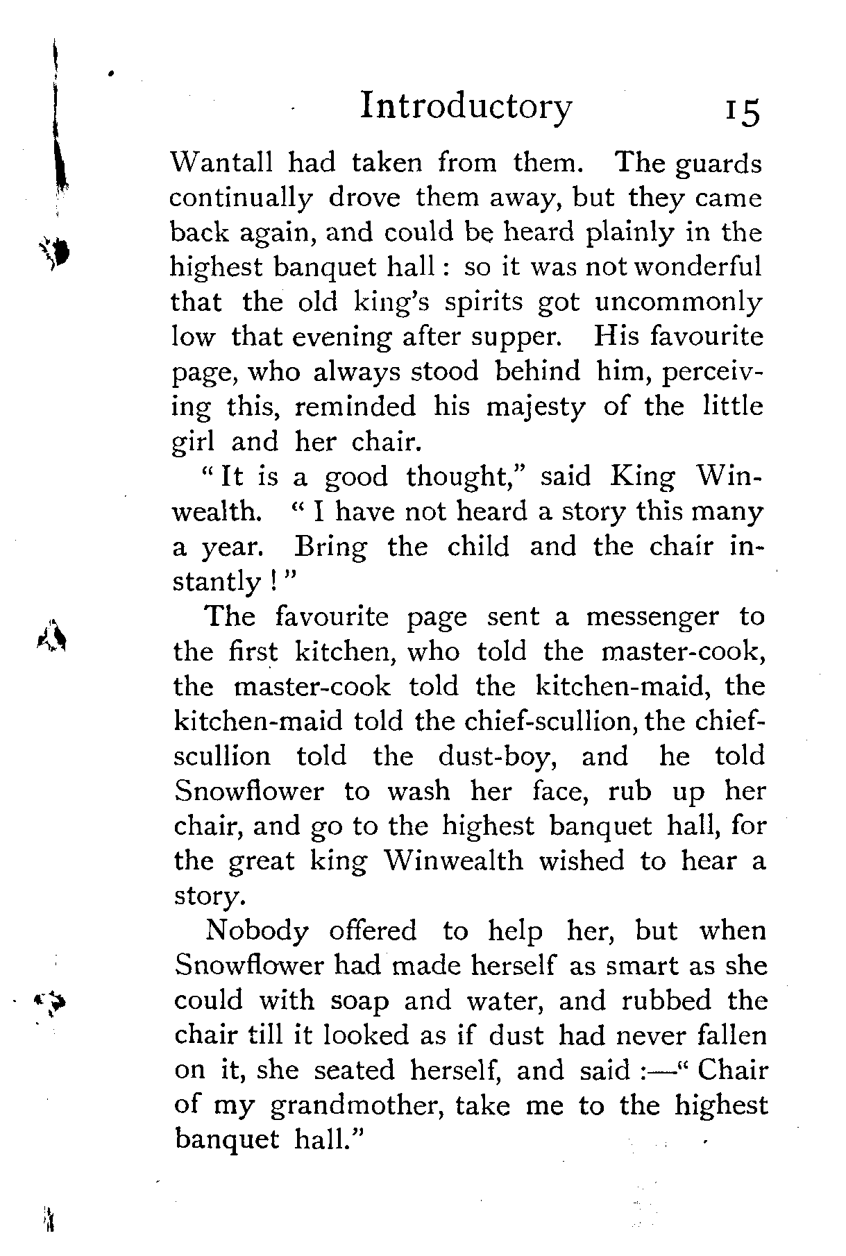 Perhaps it was these doings that brought the low spirits earlier than usual on King Winwealth, for after dinner his majesty fell into them so deeply that a message came down from the highest banquet hall, and the cupbearer told Snowflower to go up with her chair, for King Winwealth wished to hear another story.
