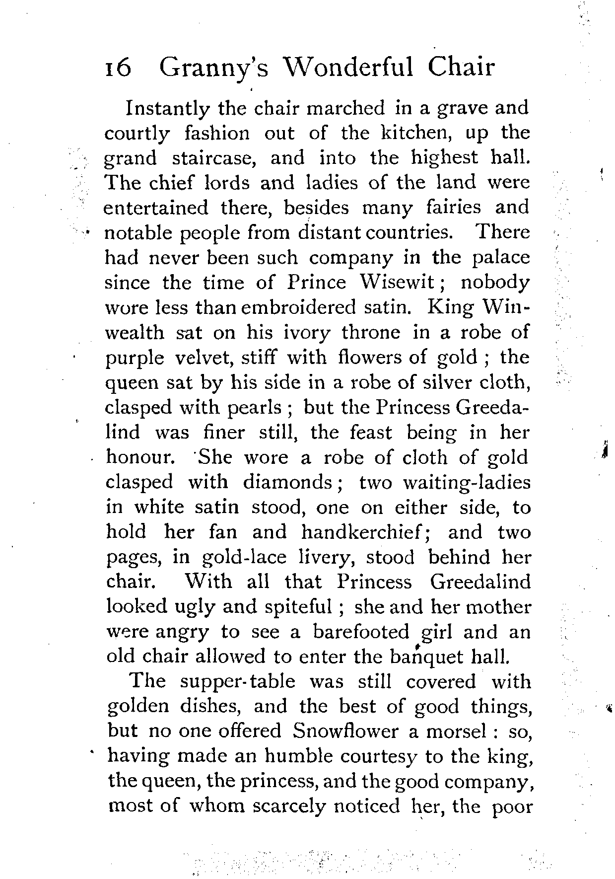 "Mamma," whispered the Princess Greedalind, while she looked ready to cry for spite, "only see that low little girl who came here in a coarse frock and barefooted, what finery and favour she has gained by her story-telling chair! All the court are praising her and overlooking me, though the feast was made in honour of my birthday. Mamma, I must have that chair from her. What business has a common little girl with anything so amusing?"