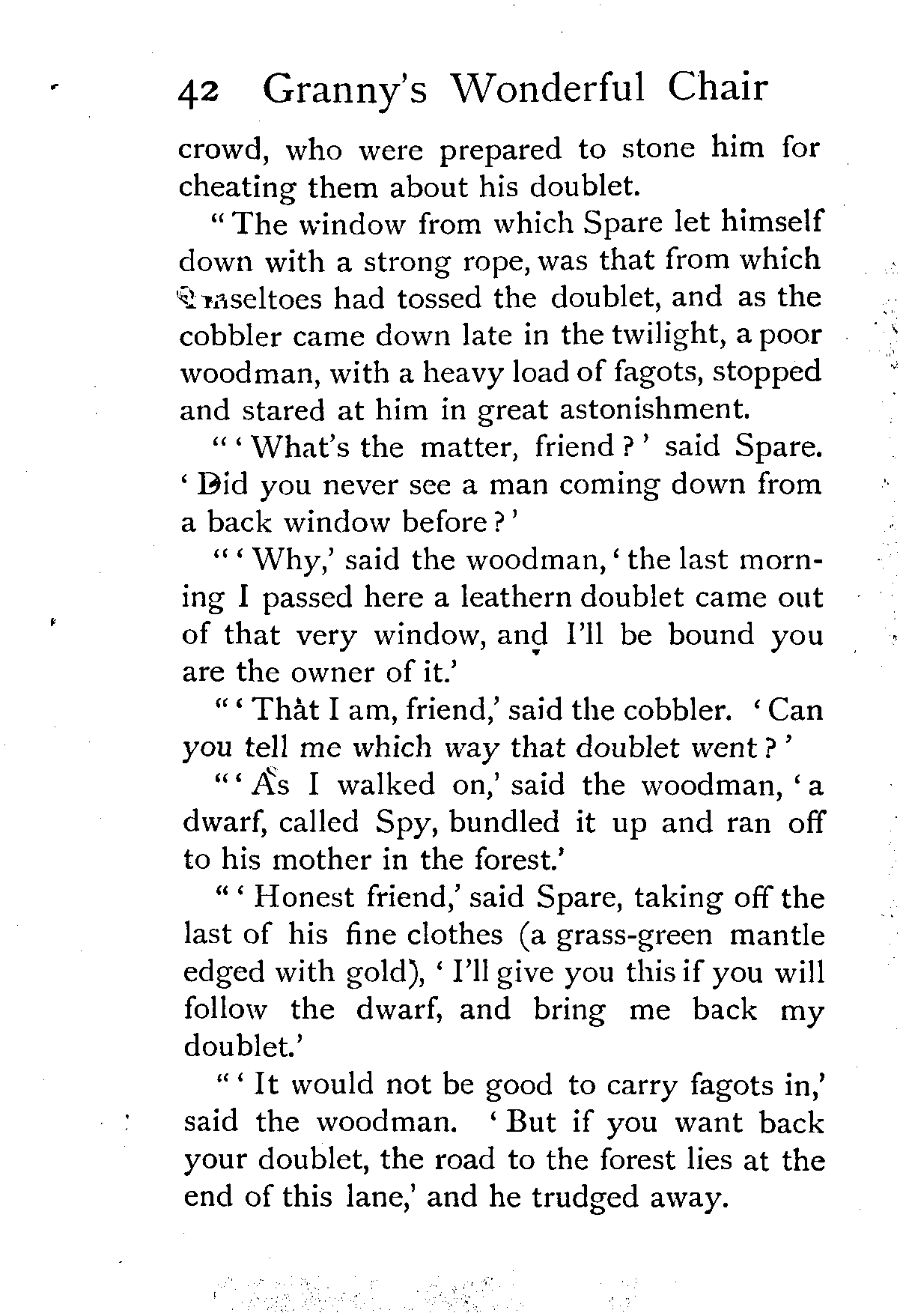 "Merrymind was good-natured and fond of news, so he helped him to tie up the loose boards and sticks that composed his stall with an old rope, and when they were hoisted on his back like a fagot, the little man said—