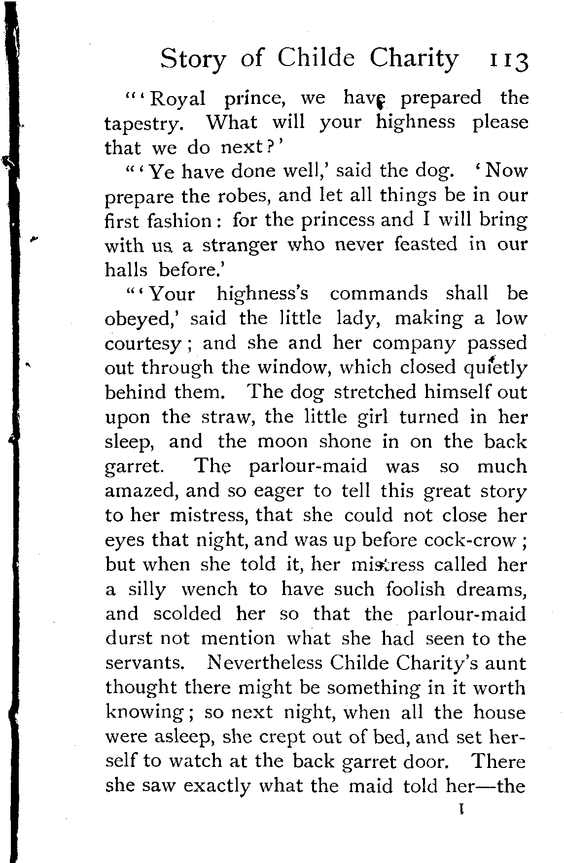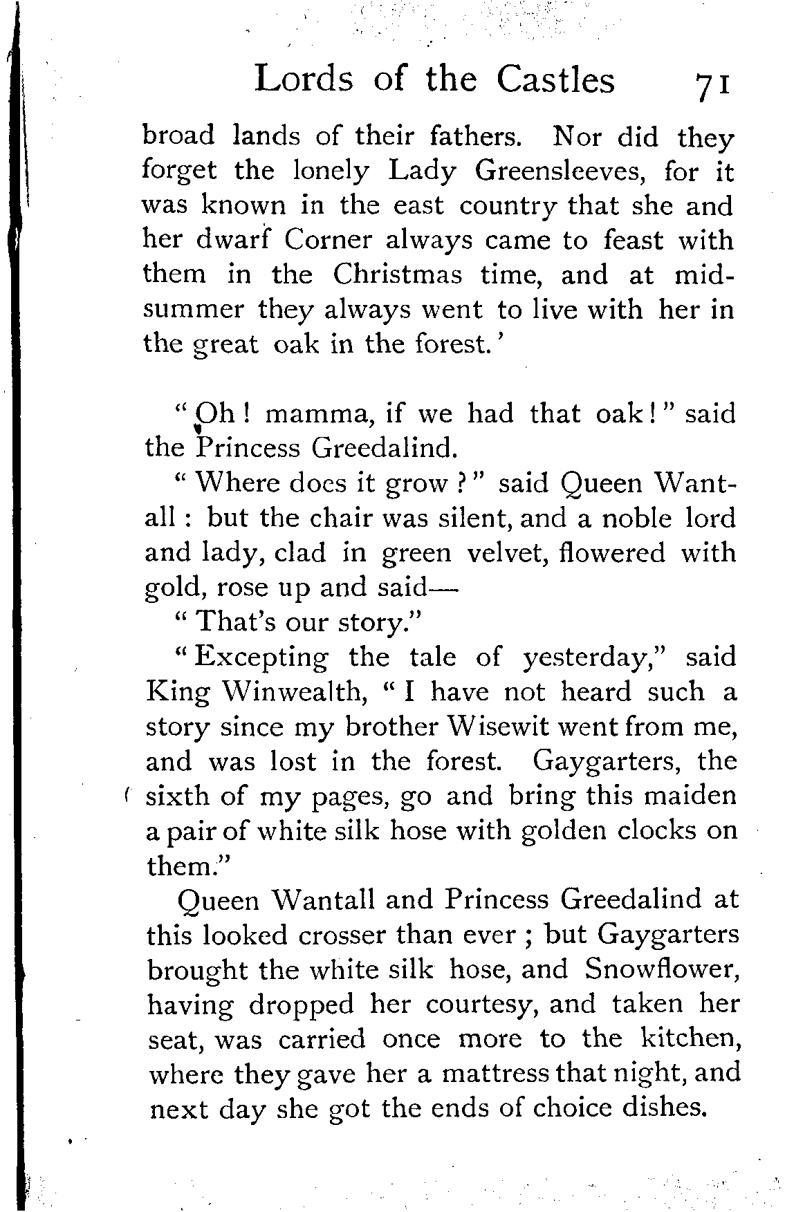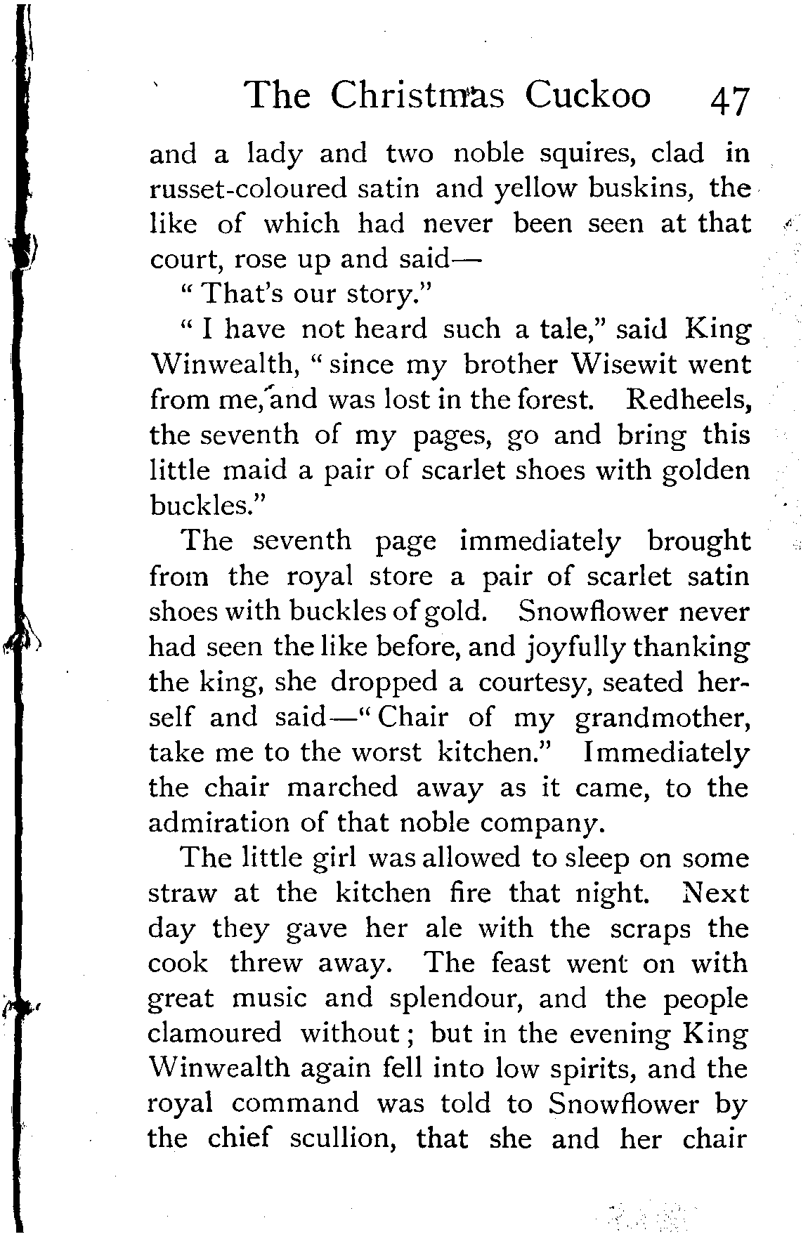 "Except the tale of yesterday, and the four that went before it, I have not heard such a story since my brother Wisewit went from me, and was lost in the forest," said King Winwealth. "Readyrein, the second of my pages, rise, and bring this maiden a purple velvet mantle."