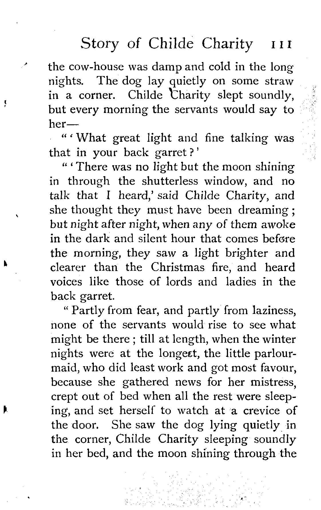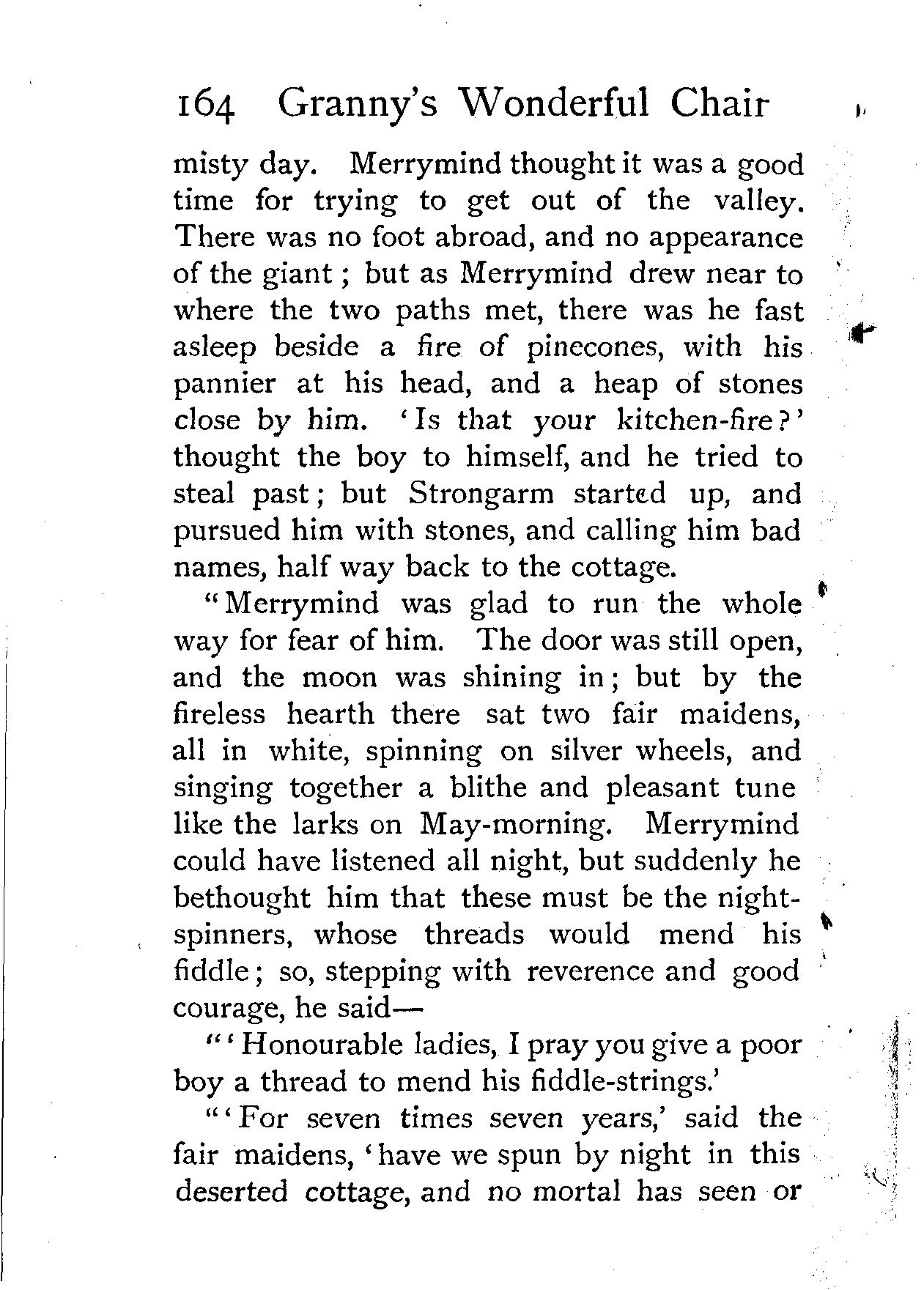 "Merrymind was glad to run the whole way for fear of him. The door was still open, and the moon was shining in; but by the fireless hearth there sat two fair maidens, all in white, spinning on silver wheels, and singing together a blithe and pleasant tune like the larks on May-morning. Merrymind could have listened all night, but suddenly he bethought him that these must be the night-spinners, whose threads would mend his fiddle; so, stepping with reverence and good courage, he said—