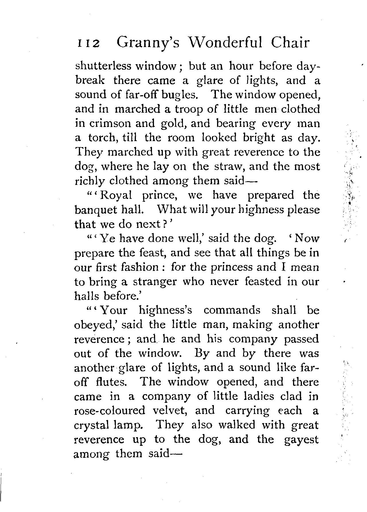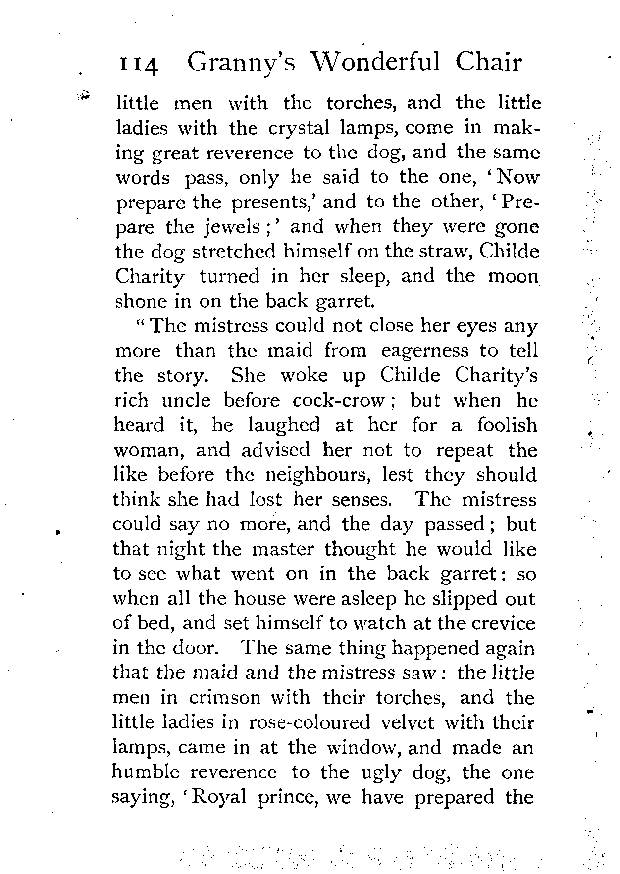 Now the little girl put on all her finery, from the pink shoes to the purple mantle, and went up with her chair, looking so like a princess that the whole company rose to welcome her. But having made her courtesy, and laid down her head, saying, "Chair of my grandmother, tell me a story," the clear voice from under the cushion answered—
