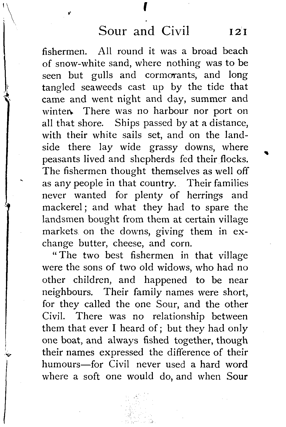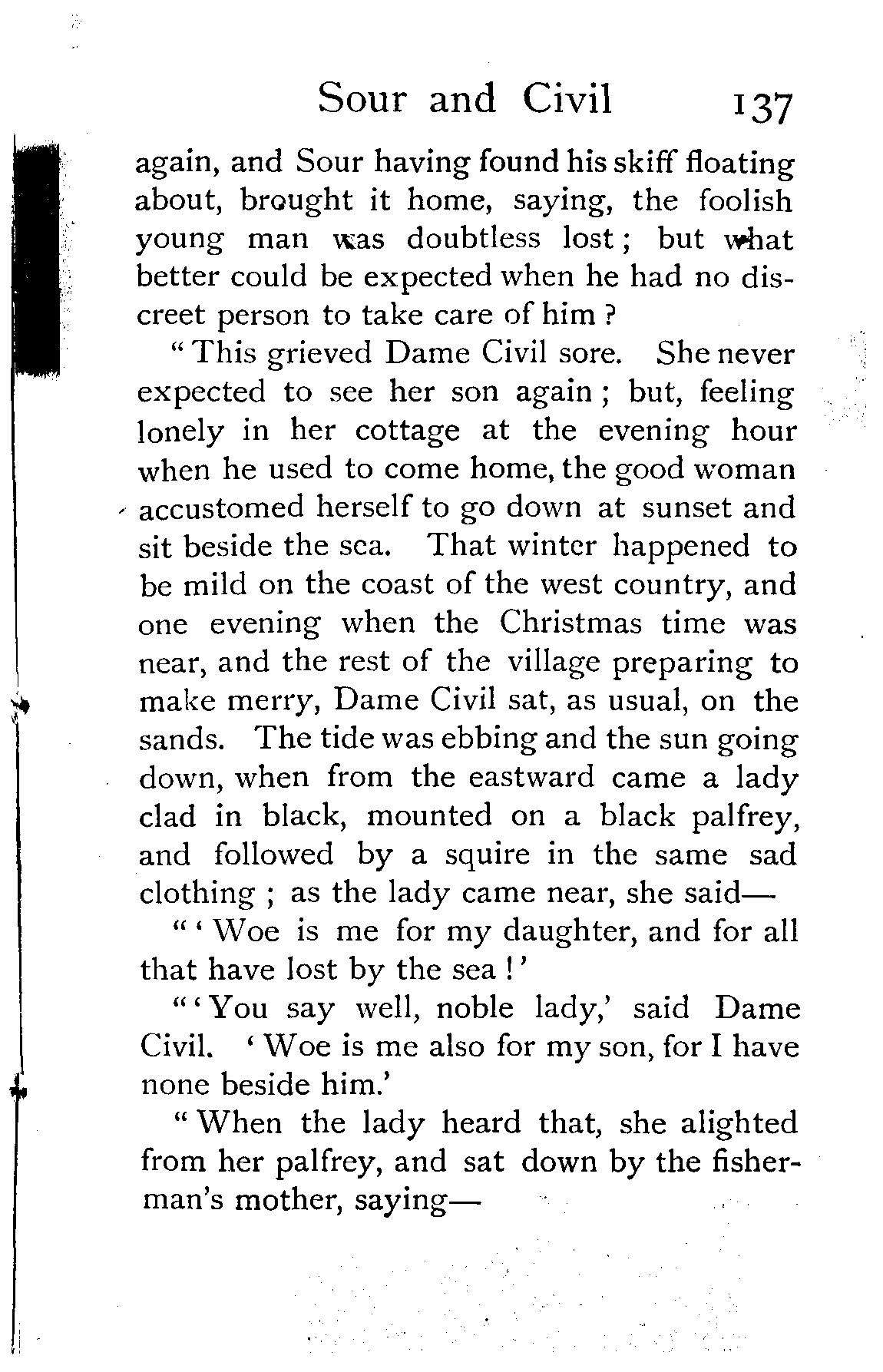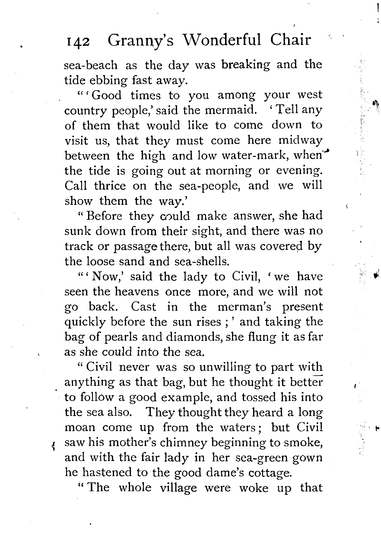 "Civil never was so unwilling to part with anything as that bag, but he thought it better to follow a good example, and tossed his into the sea also. They thought they heard a long moan come up from the waters; but Civil saw his mother's chimney beginning to smoke, and with the fair lady in her sea-green gown he hastened to the good dame's cottage.