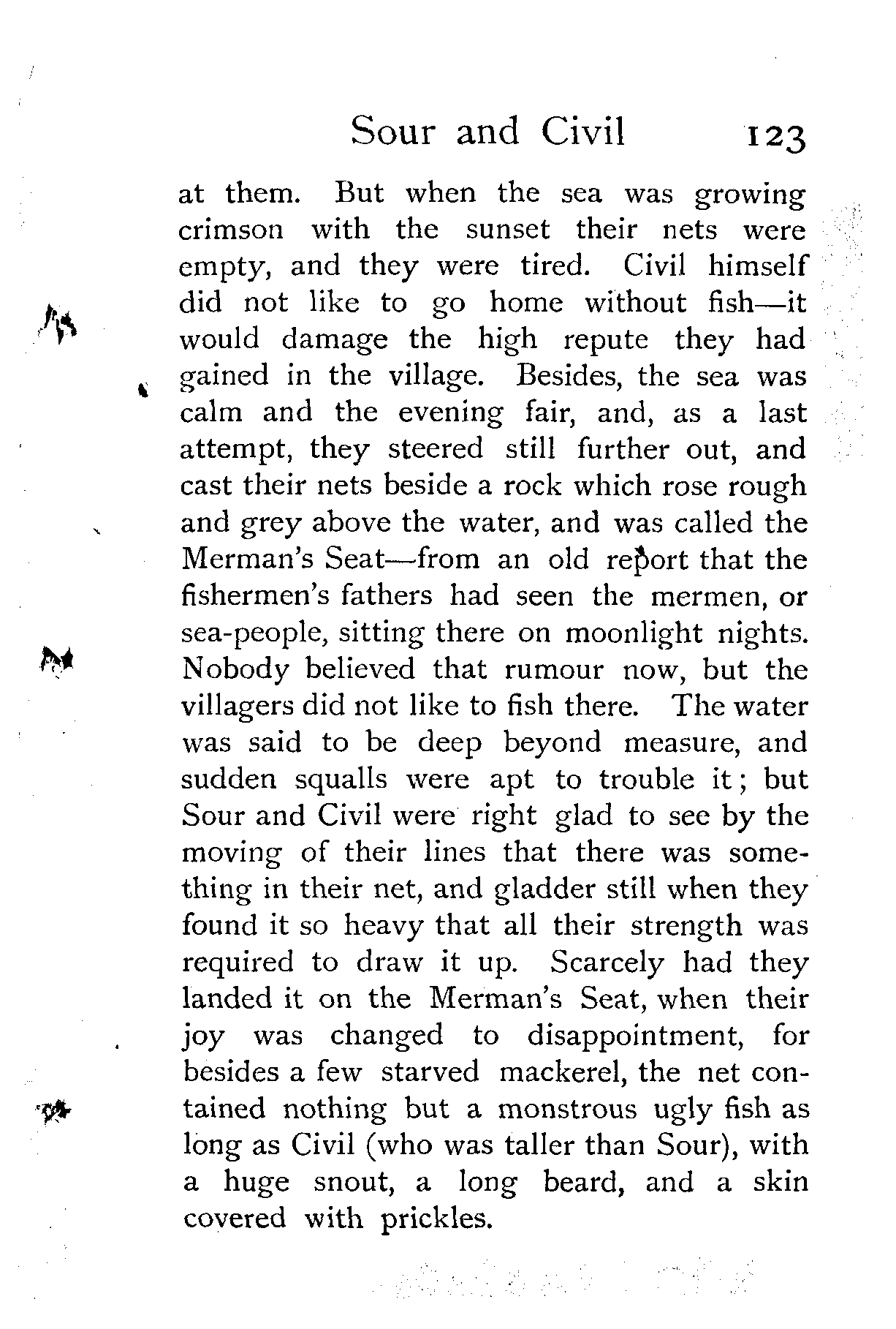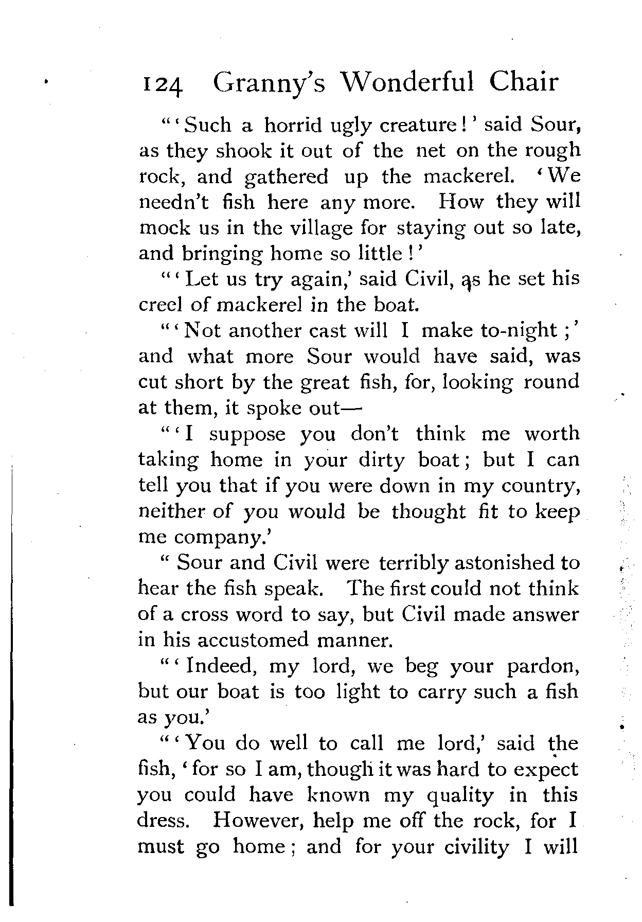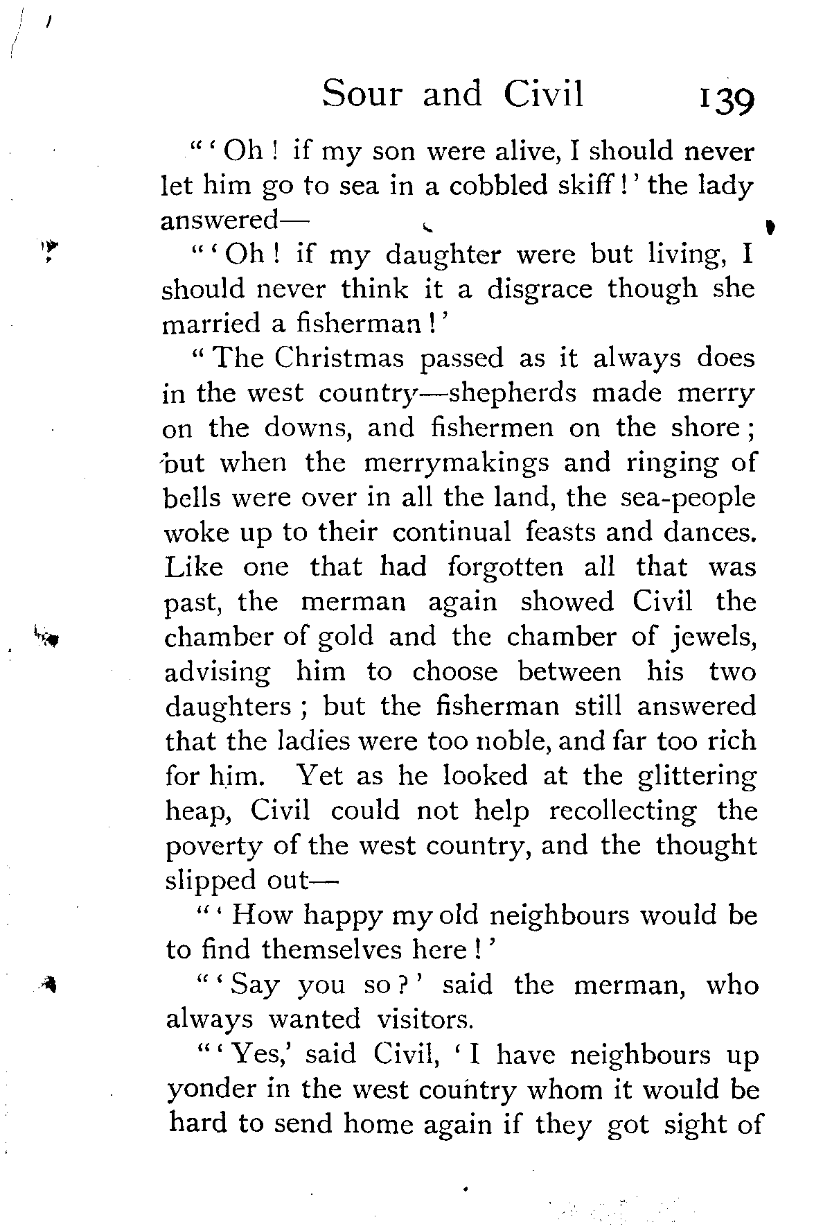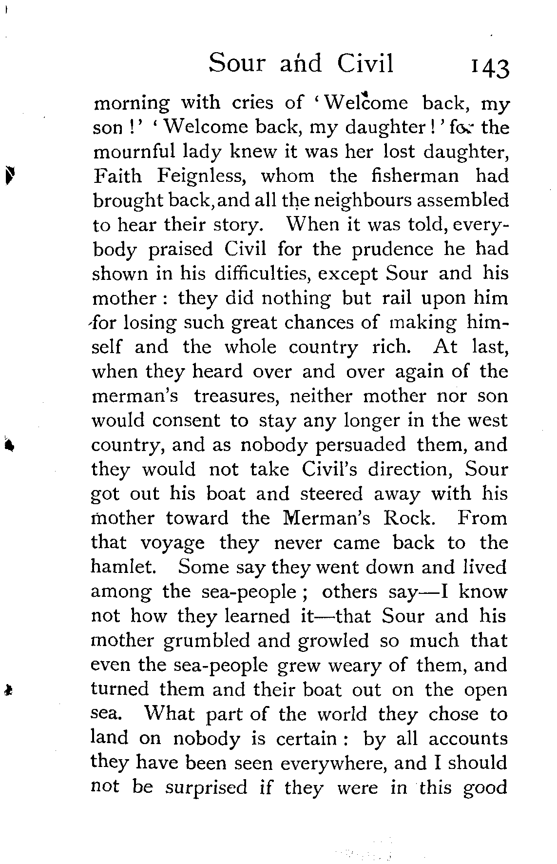 "The whole village were woke up that [Pg 143]morning with cries of 'Welcome back, my son!' 'Welcome back, my daughter!' for the mournful lady knew it was her lost daughter, Faith Feignless, whom the fisherman had brought back, and all the neighbours assembled to hear their story. When it was told, everybody praised Civil for the prudence he had shown in his difficulties, except Sour and his mother: they did nothing but rail upon him for losing such great chances of making himself and the whole country rich. At last, when they heard over and over again of the merman's treasures, neither mother nor son would consent to stay any longer in the west country, and as nobody persuaded them, and they would not take Civil's direction, Sour got out his boat and steered away with his mother toward the Merman's Rock. From that voyage they never came back to the hamlet. Some say they went down and lived among the sea-people; others say—I know not how they learned it—that Sour and his mother grumbled and growled so much that even the sea-people grew weary of them, and turned them and their boat out on the open sea. What part of the world they chose to land on nobody is certain: by all accounts they have been seen everywhere, and I should not be surprised if they were in this good [Pg 144]company. As for Civil, he married Faith Feignless, and became a great lord."