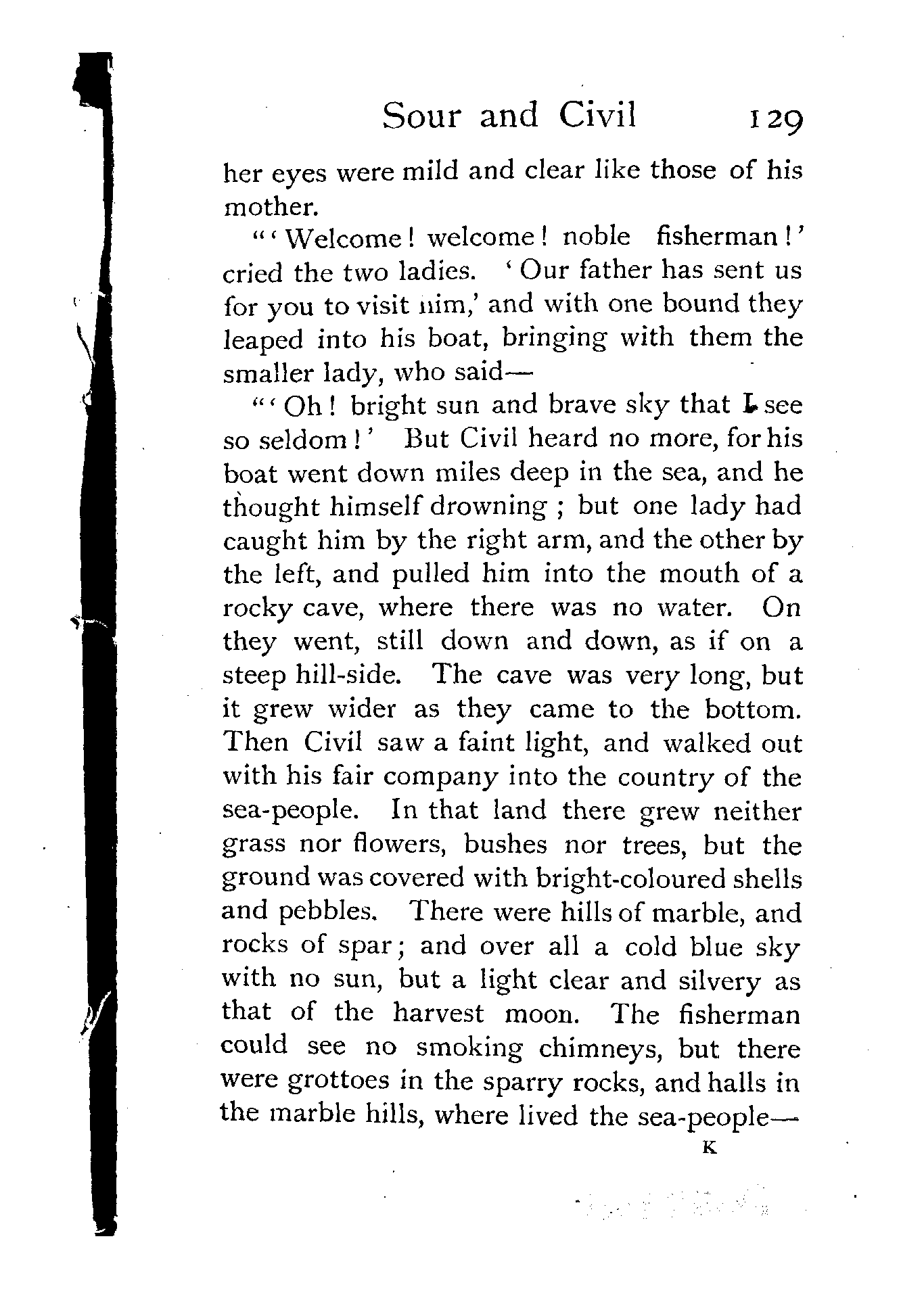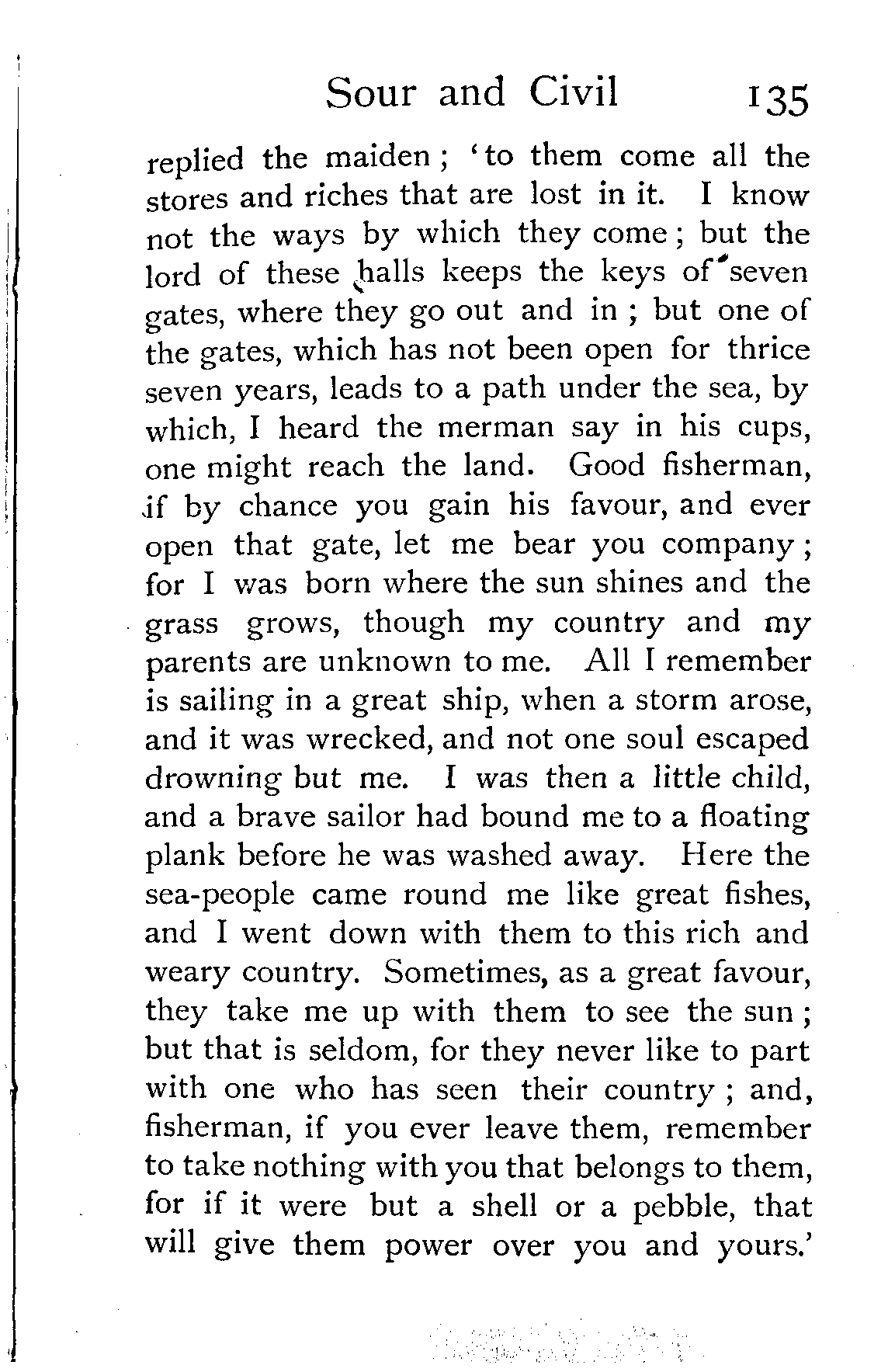 "'Now,' said the lady to Civil, 'we have seen the heavens once more, and we will not go back. Cast in the merman's present quickly before the sun rises;' and taking the bag of pearls and diamonds, she flung it as far as she could into the sea.
