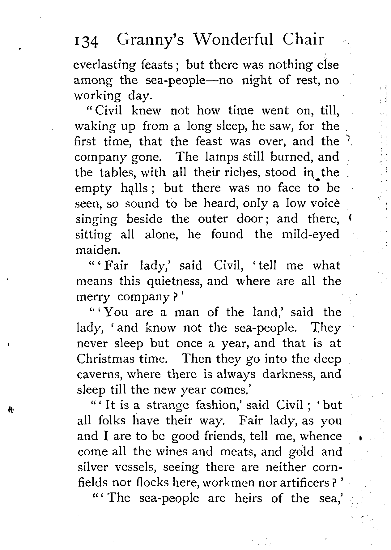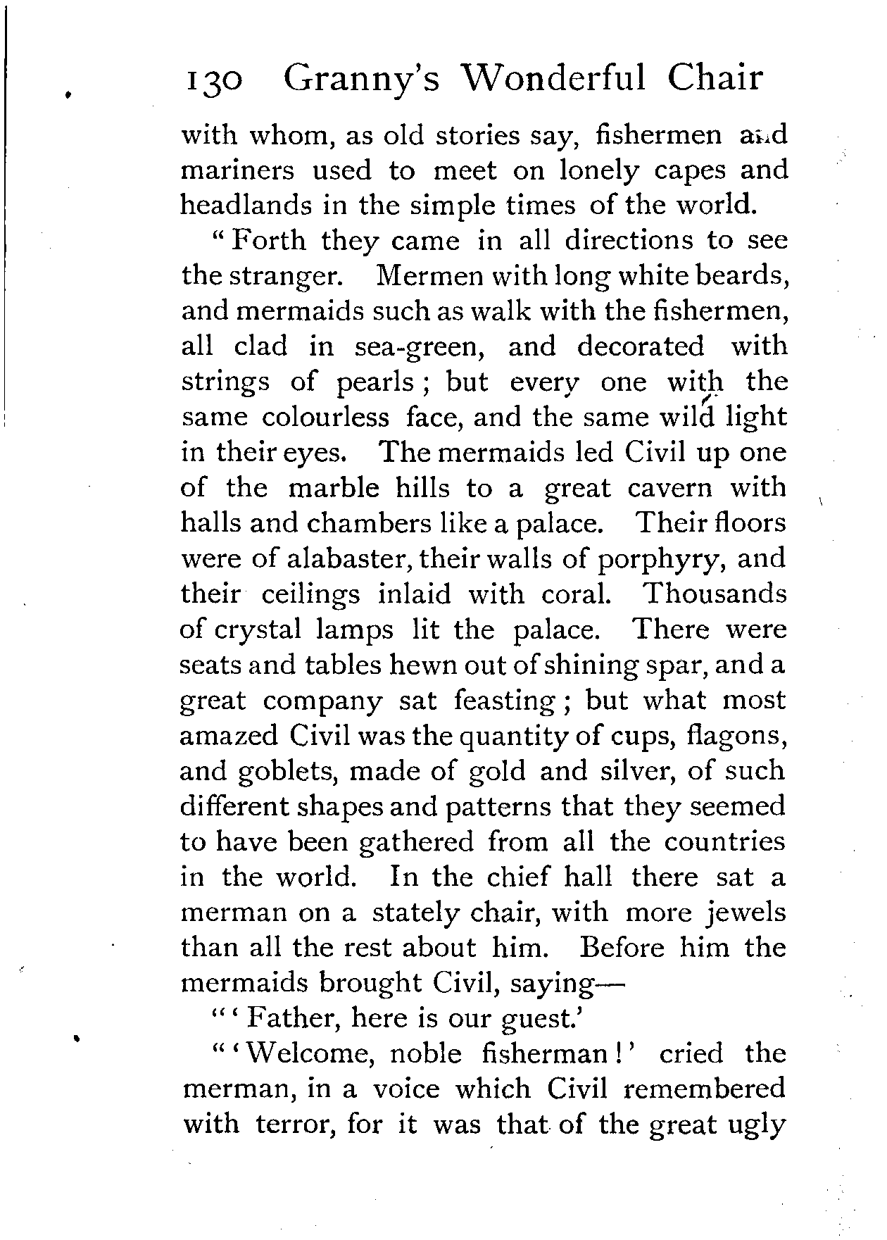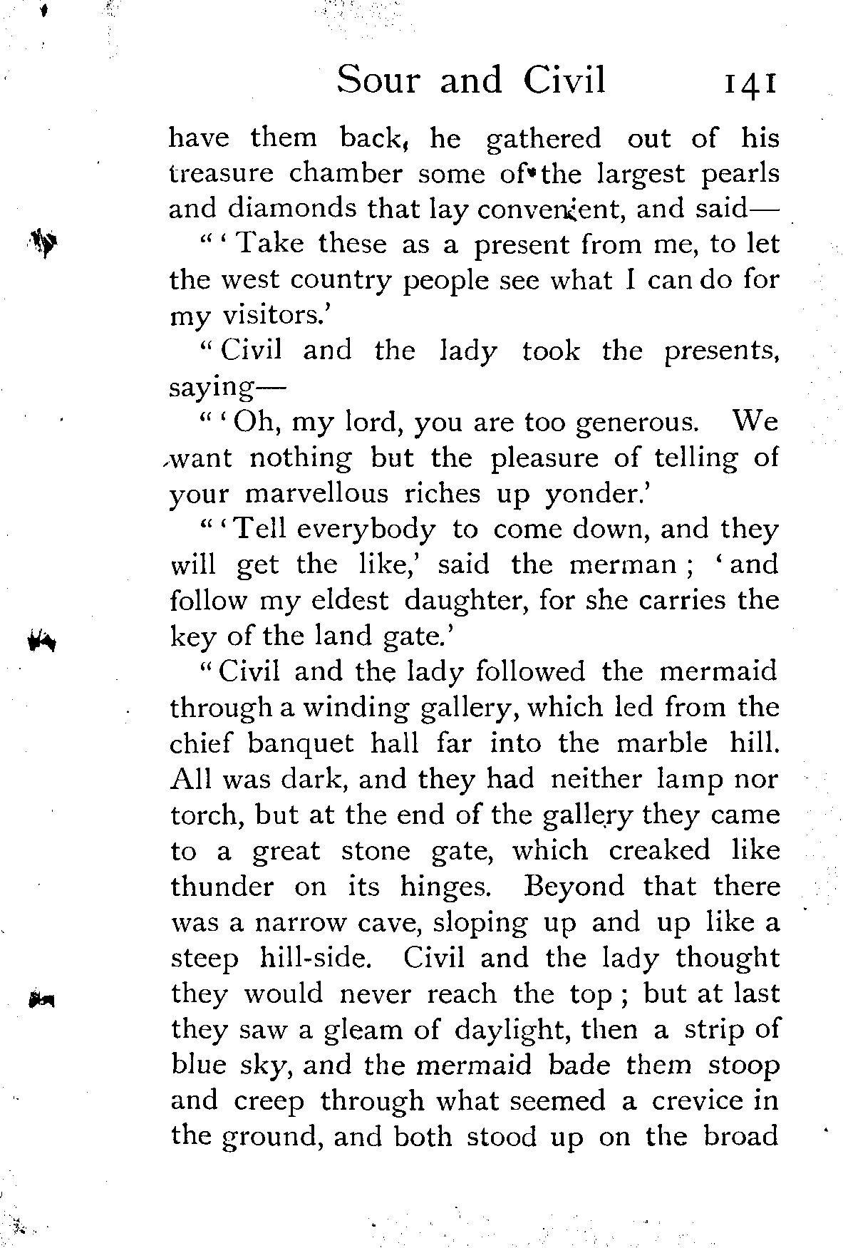 "Civil and the lady followed the mermaid through a winding gallery, which led from the chief banquet hall far into the marble hill. All was dark, and they had neither lamp nor torch, but at the end of the gallery they came to a great stone gate, which creaked like thunder on its hinges. Beyond that there was a narrow cave, sloping up and up like a steep hill-side. Civil and the lady thought they would never reach the top; but at last they saw a gleam of daylight, then a strip of blue sky, and the mermaid bade them stoop and creep through what seemed a crevice in the ground, and both stood up on the broad [Pg 142]sea-beach as the day was breaking and the tide ebbing fast away.