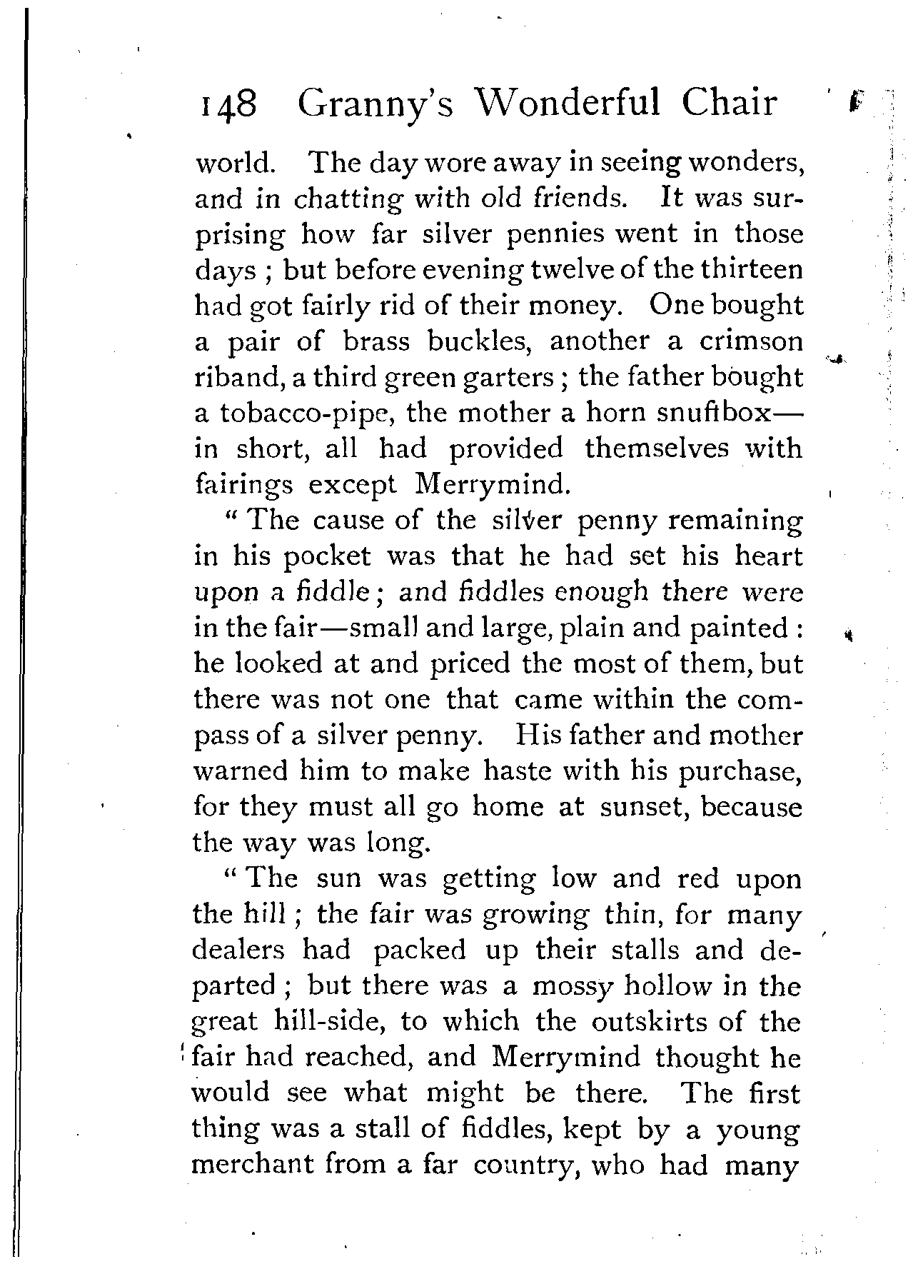 "The cause of the silver penny remaining in his pocket was that he had set his heart upon a fiddle; and fiddles enough there were in the fair—small and large, plain and painted: he looked at and priced the most of them, but there was not one that came within the compass of a silver penny. His father and mother warned him to make haste with his purchase, for they must all go home at sunset, because the way was long.
