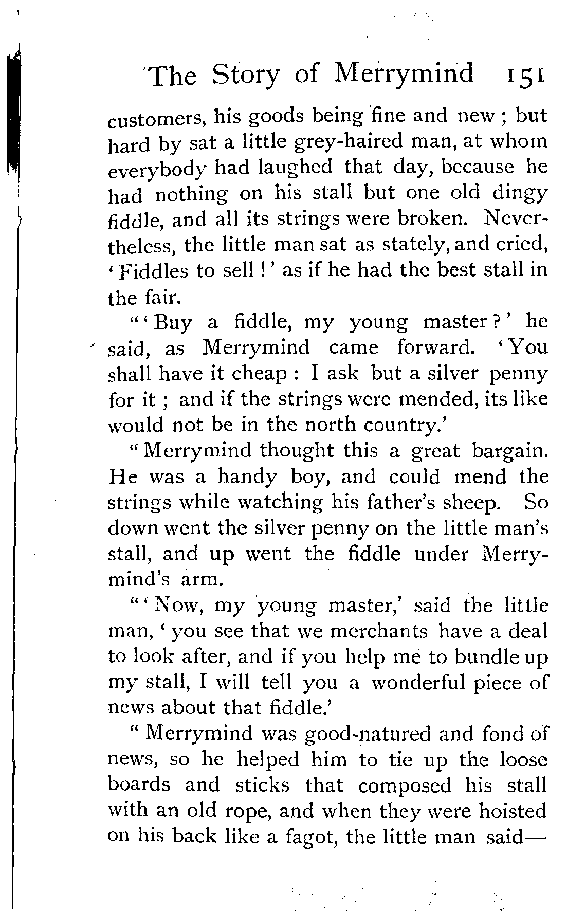 "'Buy a fiddle, my young master?' he said, as Merrymind came forward. 'You shall have it cheap: I ask but a silver penny for it; and if the strings were mended, its like would not be in the north country.'