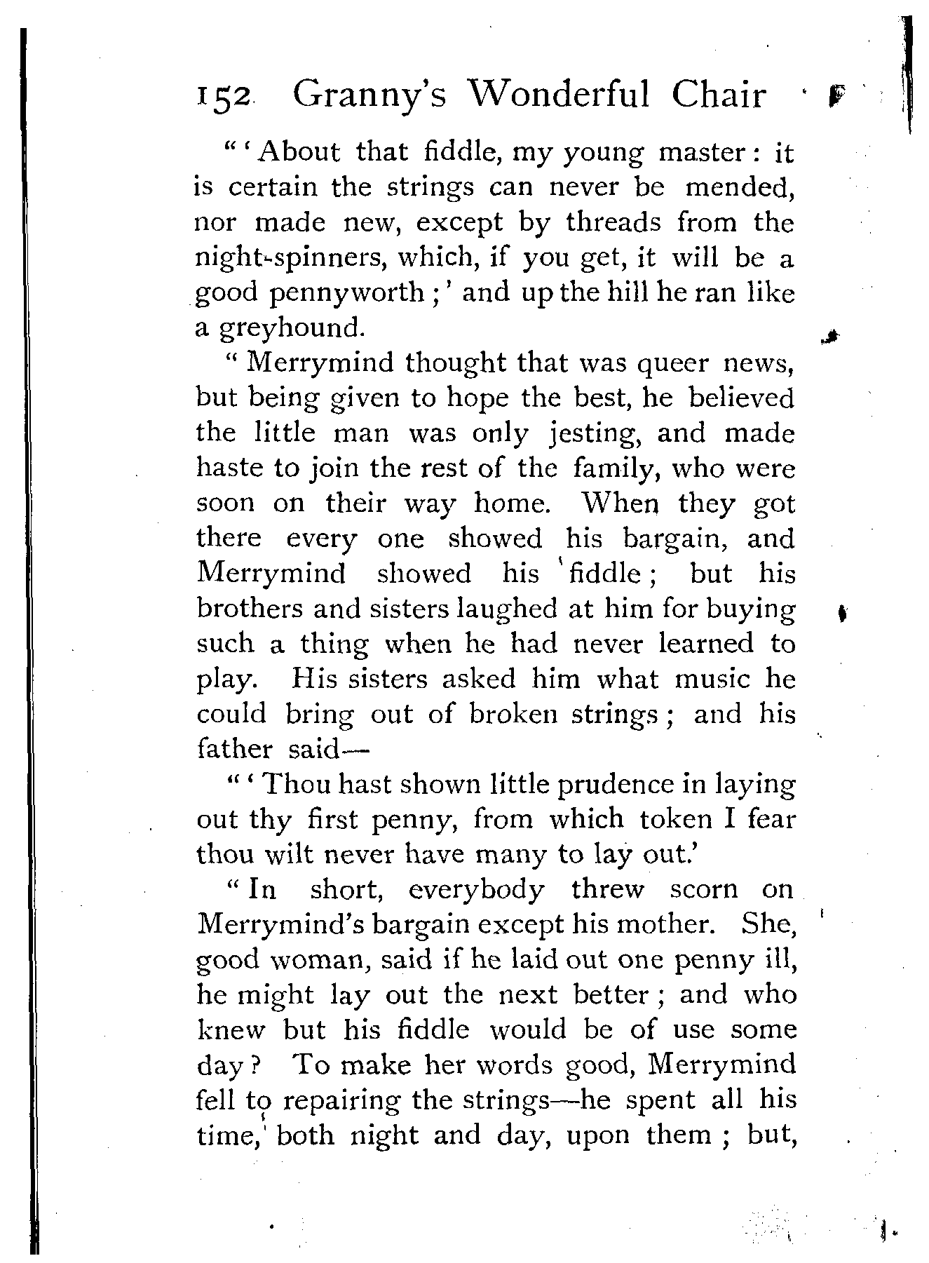 "In short, everybody threw scorn on Merrymind's bargain except his mother. She, good woman, said if he laid out one penny ill, he might lay out the next better; and who knew but his fiddle would be of use some day? To make her words good, Merrymind fell to repairing the strings—he spent all his time, both night and day, upon them; but, [Pg 153]true to the little man's parting words, no mending would stand, and no string would hold on that fiddle. Merrymind tried everything, and wearied himself to no purpose. At last he thought of inquiring after people who spun at night; and this seemed such a good joke to the north country people, that they wanted no other till the next fair.