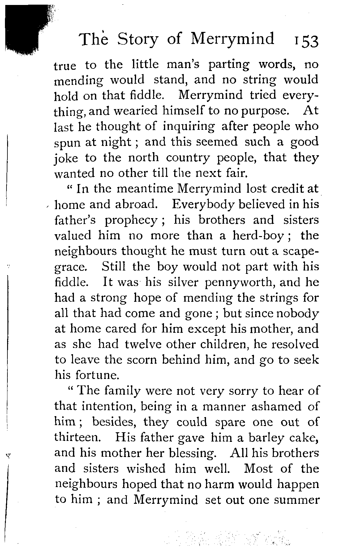 "The family were not very sorry to hear of that intention, being in a manner ashamed of him; besides, they could spare one out of thirteen. His father gave him a barley cake, and his mother her blessing. All his brothers and sisters wished him well. Most of the neighbours hoped that no harm would happen to him; and Merrymind set out one summer [Pg 154]morning with the broken-stringed fiddle under his arm.