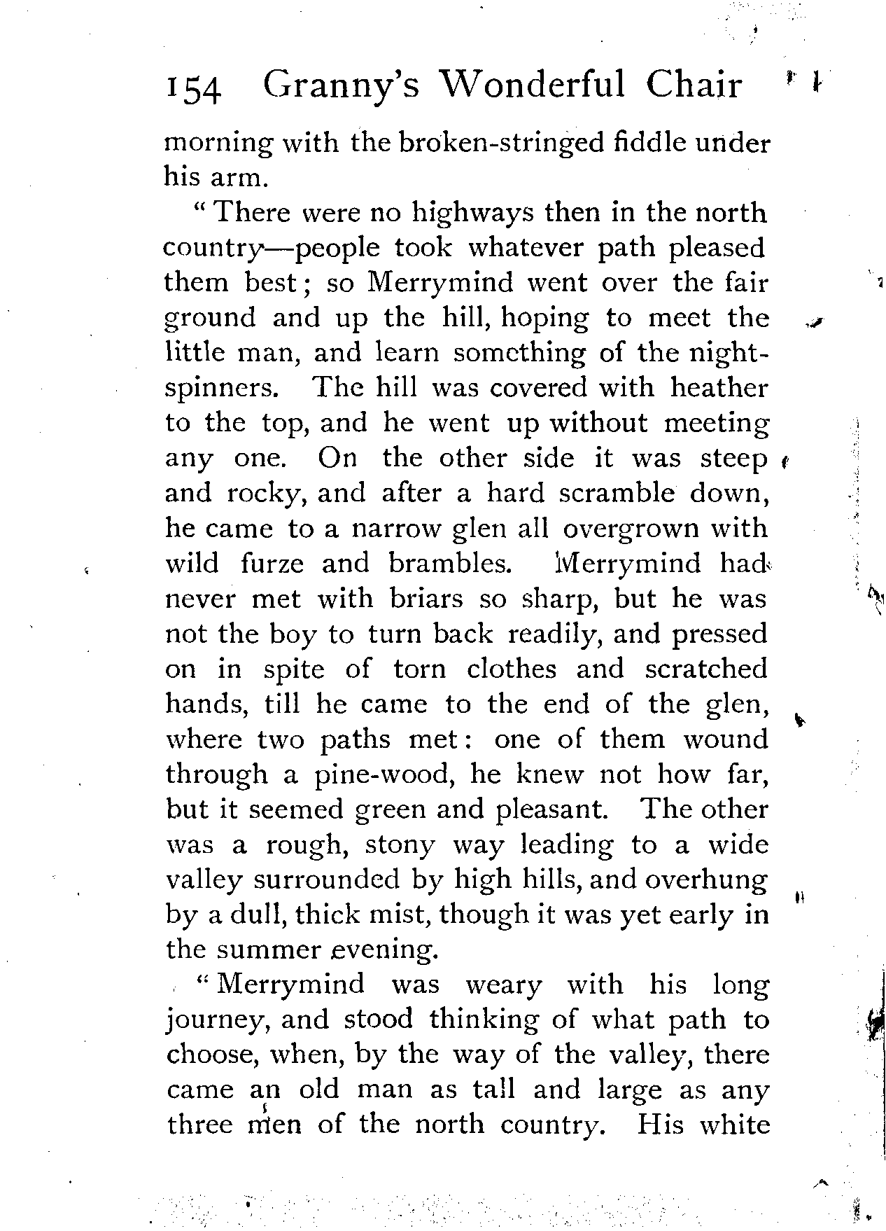 "There were no highways then in the north country—people took whatever path pleased them best; so Merrymind went over the fair ground and up the hill, hoping to meet the little man, and learn something of the night-spinners. The hill was covered with heather to the top, and he went up without meeting any one. On the other side it was steep and rocky, and after a hard scramble down, he came to a narrow glen all overgrown with wild furze and brambles. Merrymind had never met with briars so sharp, but he was not the boy to turn back readily, and pressed on in spite of torn clothes and scratched hands, till he came to the end of the glen, where two paths met: one of them wound through a pine-wood, he knew not how far, but it seemed green and pleasant. The other was a rough, stony way leading to a wide valley surrounded by high hills, and overhung by a dull, thick mist, though it was yet early in the summer evening.