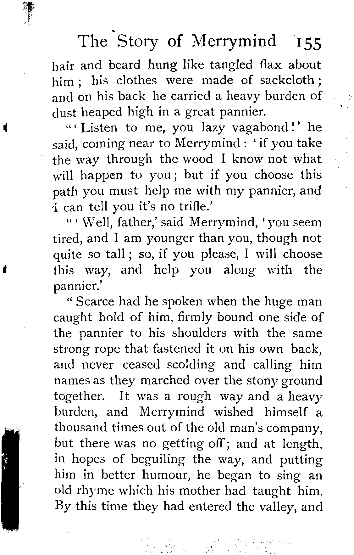 "'Well, father,' said Merrymind, 'you seem tired, and I am younger than you, though not quite so tall; so, if you please, I will choose this way, and help you along with the pannier.'