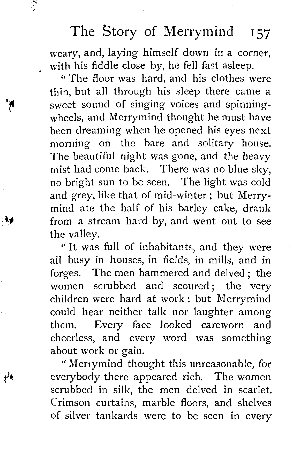 "Merrymind thought this unreasonable, for everybody there appeared rich. The women scrubbed in silk, the men delved in scarlet. Crimson curtains, marble floors, and shelves of silver tankards were to be seen in every [Pg 158]house; but their owners took neither ease nor pleasure in them, and every one laboured as it were for life.