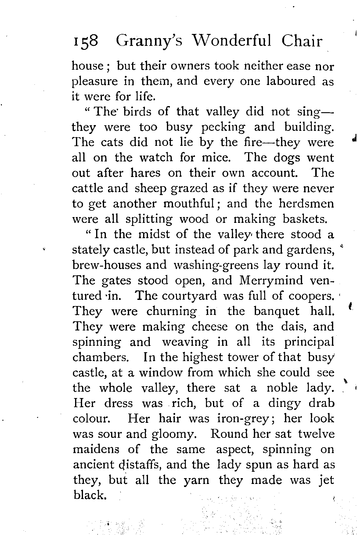 "In the midst of the valley there stood a stately castle, but instead of park and gardens, brew-houses and washing-greens lay round it. The gates stood open, and Merrymind ventured in. The courtyard was full of coopers. They were churning in the banquet hall. They were making cheese on the dais, and spinning and weaving in all its principal chambers. In the highest tower of that busy castle, at a window from which she could see the whole valley, there sat a noble lady. Her dress was rich, but of a dingy drab colour. Her hair was iron-grey; her look was sour and gloomy. Round her sat twelve maidens of the same aspect, spinning on ancient distaffs, and the lady spun as hard as they, but all the yarn they made was jet black.