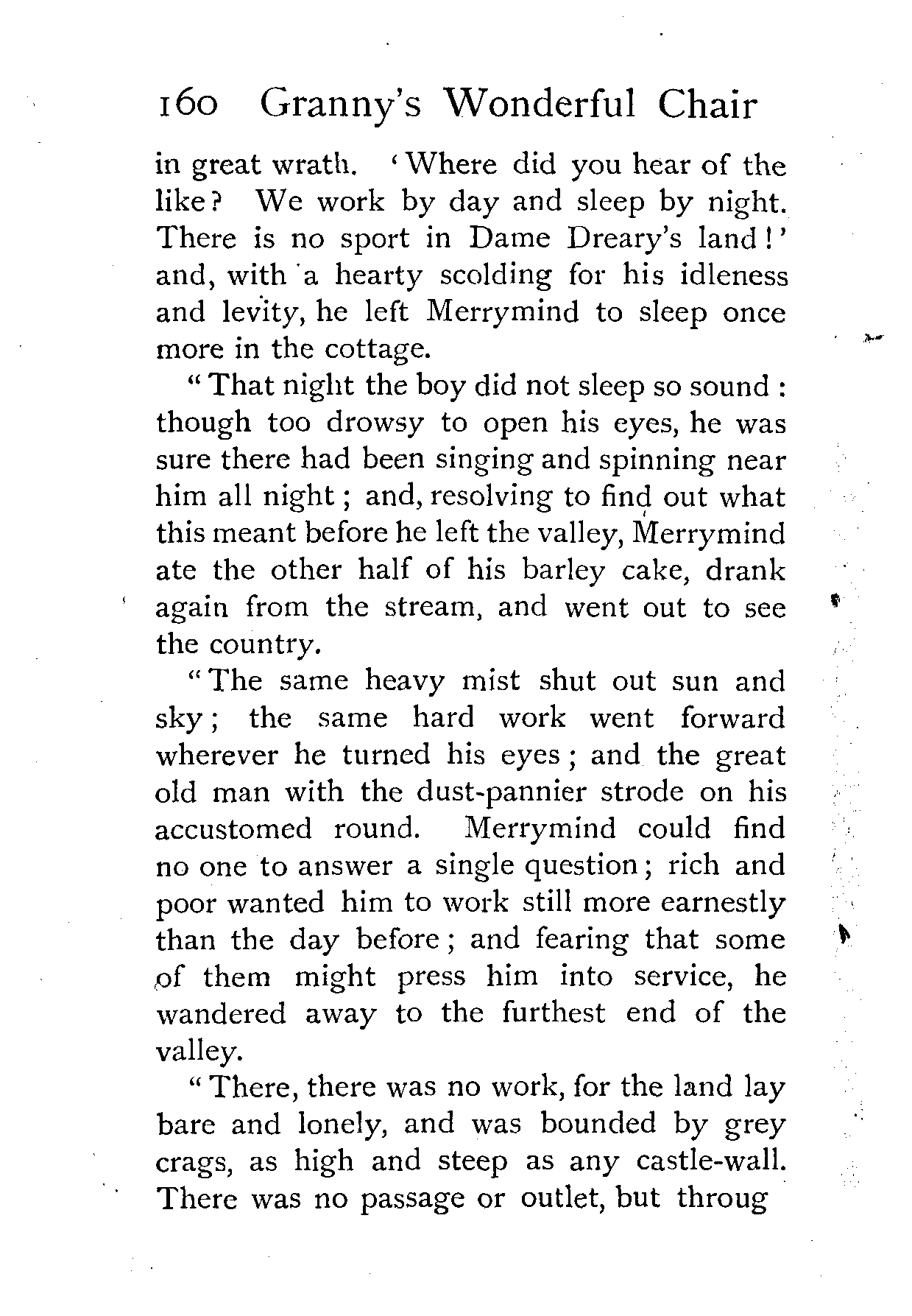 "'Sport and pastime!' cried the old man, [Pg 160]in great wrath. 'Where did you hear of the like? We work by day and sleep by night. There is no sport in Dame Dreary's land!' and, with a hearty scolding for his idleness and levity, he left Merrymind to sleep once more in the cottage.