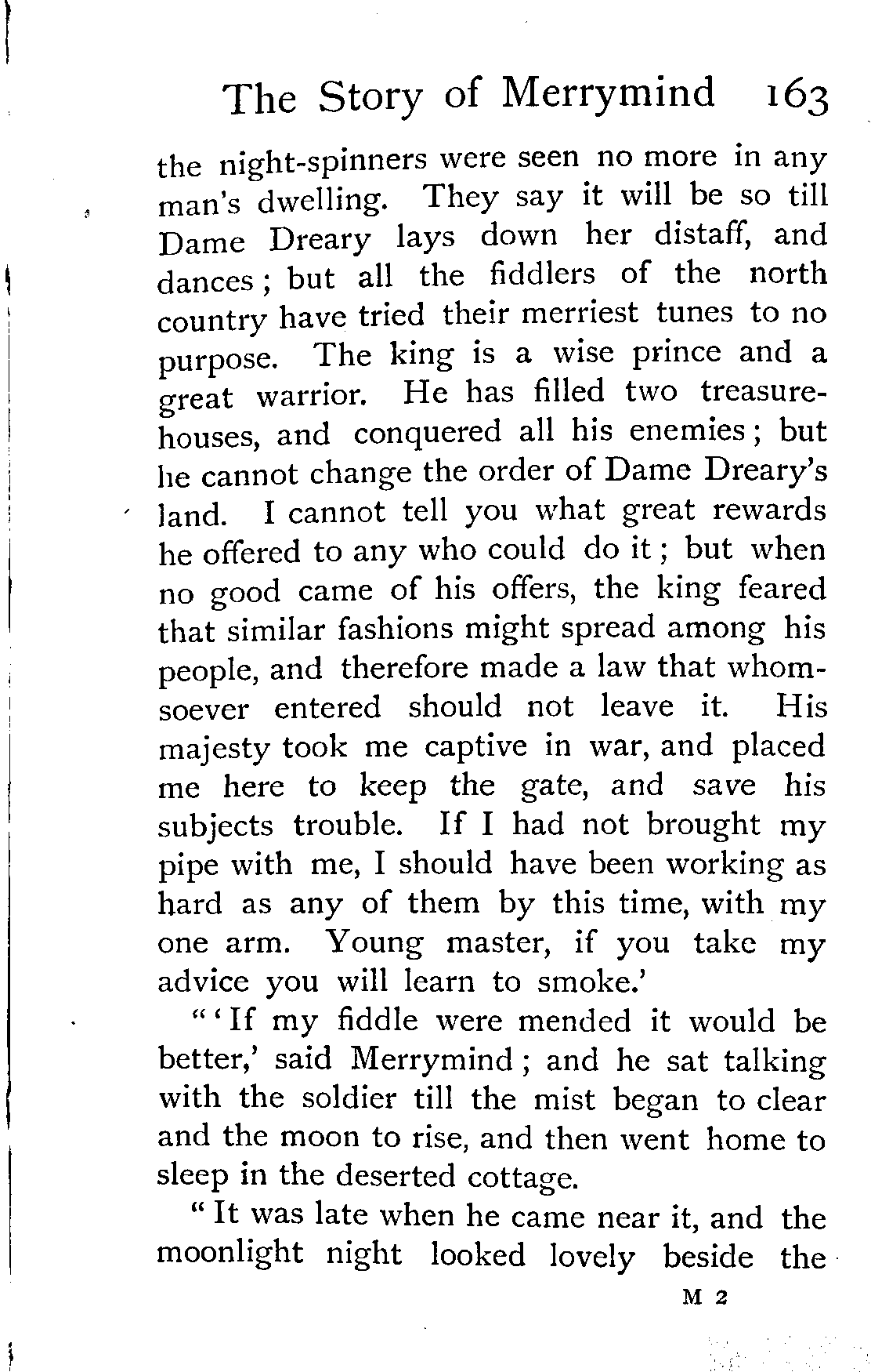 "'If my fiddle were mended it would be better,' said Merrymind; and he sat talking with the soldier till the mist began to clear and the moon to rise, and then went home to sleep in the deserted cottage.