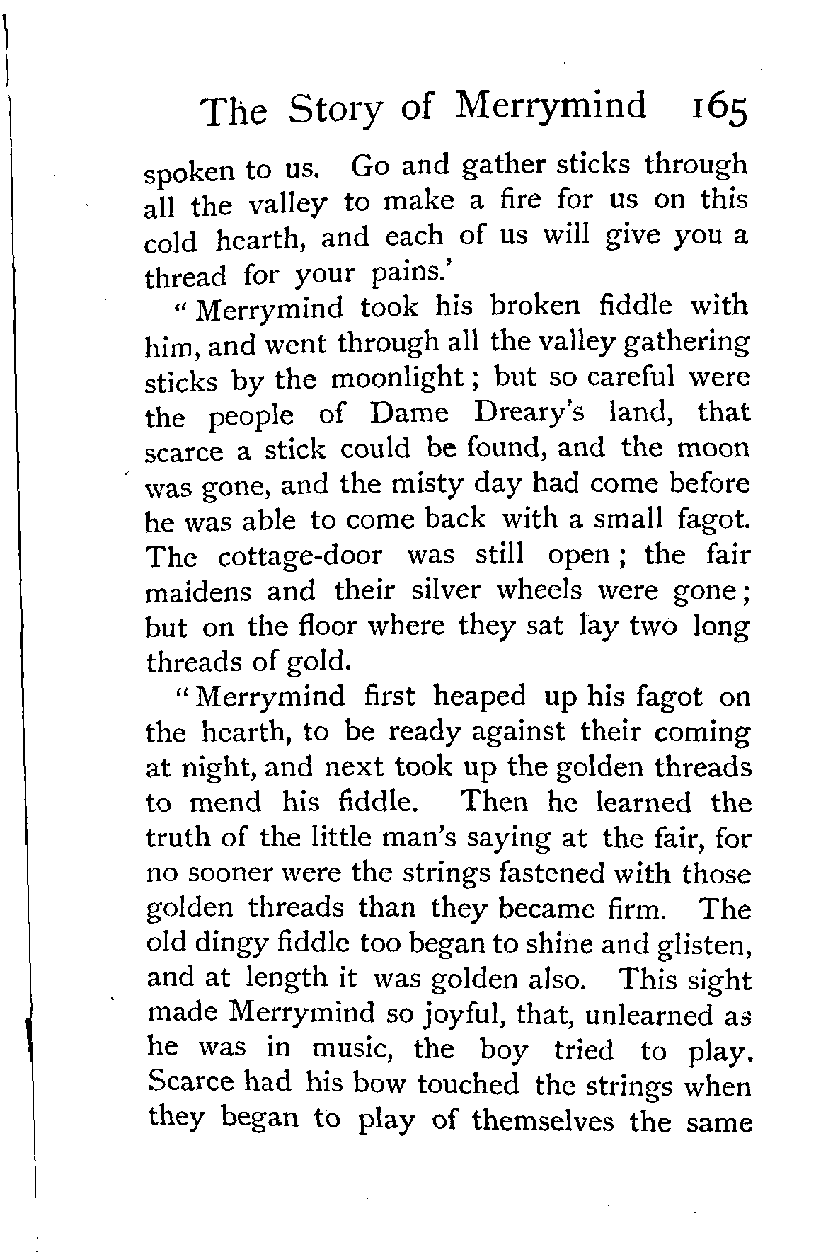 "Merrymind took his broken fiddle with him, and went through all the valley gathering sticks by the moonlight; but so careful were the people of Dame Dreary's land, that scarce a stick could be found, and the moon was gone, and the misty day had come before he was able to come back with a small fagot. The cottage-door was still open; the fair maidens and their silver wheels were gone; but on the floor where they sat lay two long threads of gold.