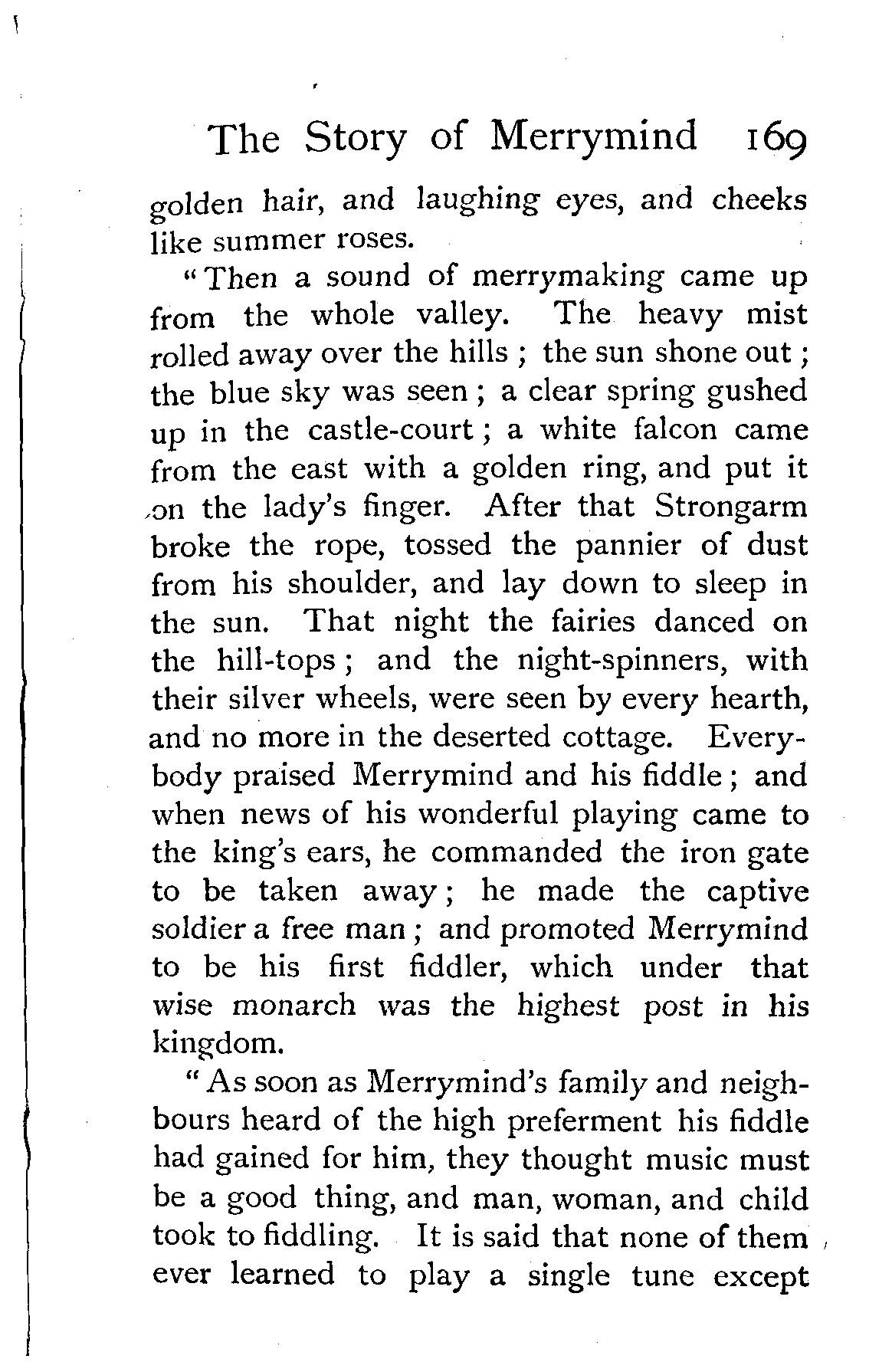 "Then a sound of merrymaking came up from the whole valley. The heavy mist rolled away over the hills; the sun shone out; the blue sky was seen; a clear spring gushed up in the castle-court; a white falcon came from the east with a golden ring, and put it on the lady's finger. After that Strongarm broke the rope, tossed the pannier of dust from his shoulder, and lay down to sleep in the sun. That night the fairies danced on the hill-tops; and the night-spinners, with their silver wheels, were seen by every hearth, and no more in the deserted cottage. Everybody praised Merrymind and his fiddle; and when news of his wonderful playing came to the king's ears, he commanded the iron gate to be taken away; he made the captive soldier a free man; and promoted Merrymind to be his first fiddler, which under that wise monarch was the highest post in his kingdom.