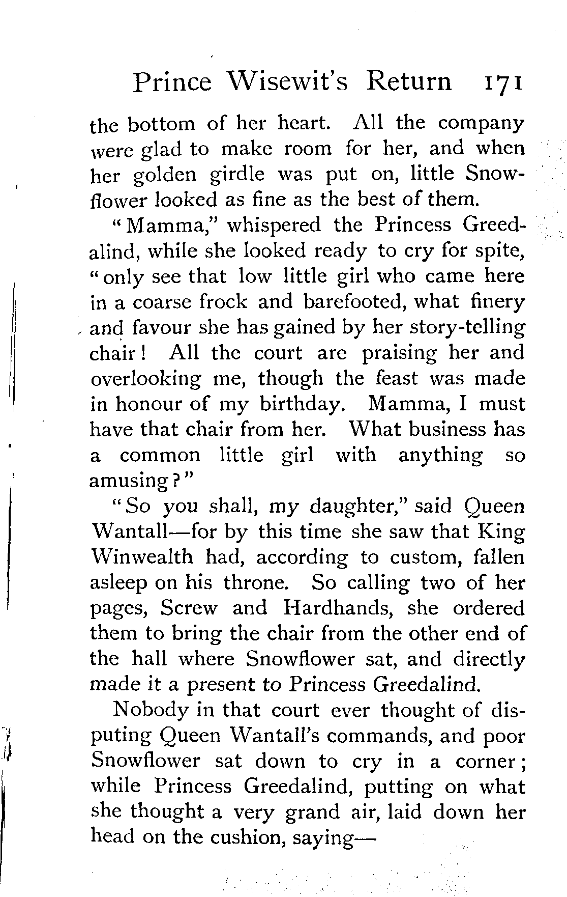 "So you shall, my daughter," said Queen Wantall—for by this time she saw that King Winwealth had, according to custom, fallen asleep on his throne. So calling two of her pages, Screw and Hardhands, she ordered them to bring the chair from the other end of the hall where Snowflower sat, and directly made it a present to Princess Greedalind.