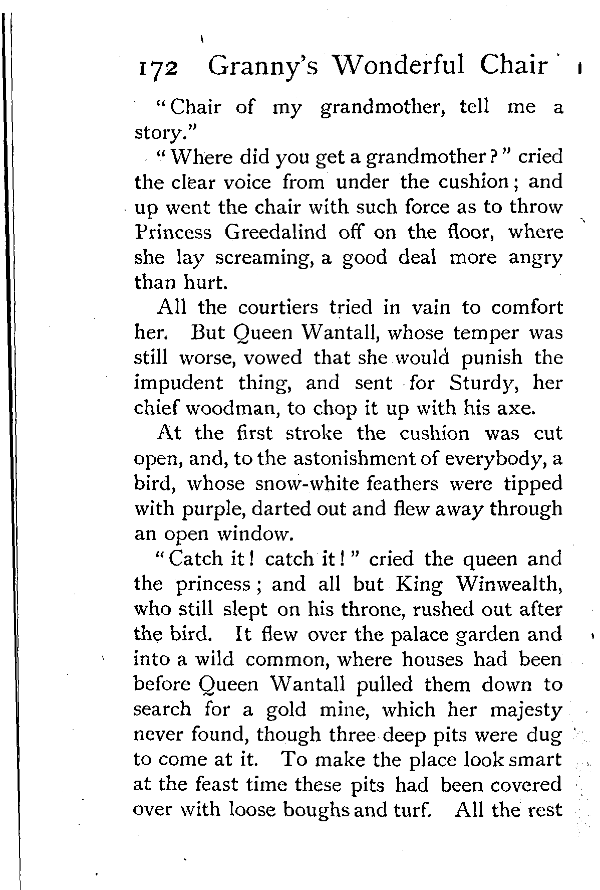 "Catch it! catch it!" cried the queen and the princess; and all but King Winwealth, who still slept on his throne, rushed out after the bird. It flew over the palace garden and into a wild common, where houses had been before Queen Wantall pulled them down to search for a gold mine, which her majesty never found, though three deep pits were dug to come at it. To make the place look smart at the feast time these pits had been covered over with loose boughs and turf. All the rest