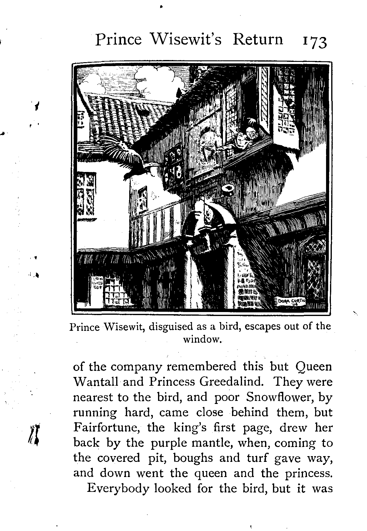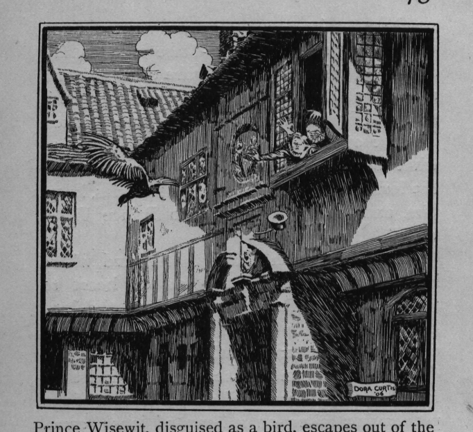 Prince Wisewit, disguised as a bird, escapes out of the window.