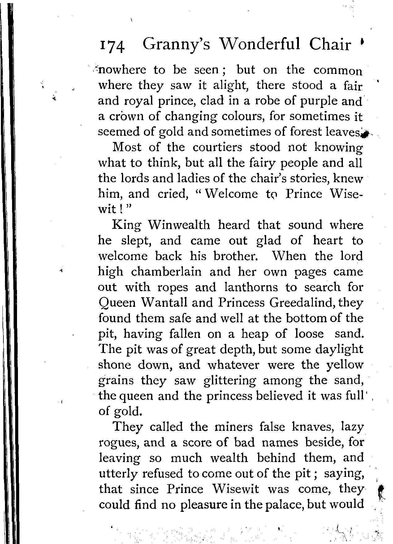 King Winwealth heard that sound where he slept, and came out glad of heart to welcome back his brother. When the lord high chamberlain and her own pages came out with ropes and lanthorns to search for Queen Wantall and Princess Greedalind, they found them safe and well at the bottom of the pit, having fallen on a heap of loose sand. The pit was of great depth, but some daylight shone down, and whatever were the yellow grains they saw glittering among the sand, the queen and the princess believed it was full of gold.
