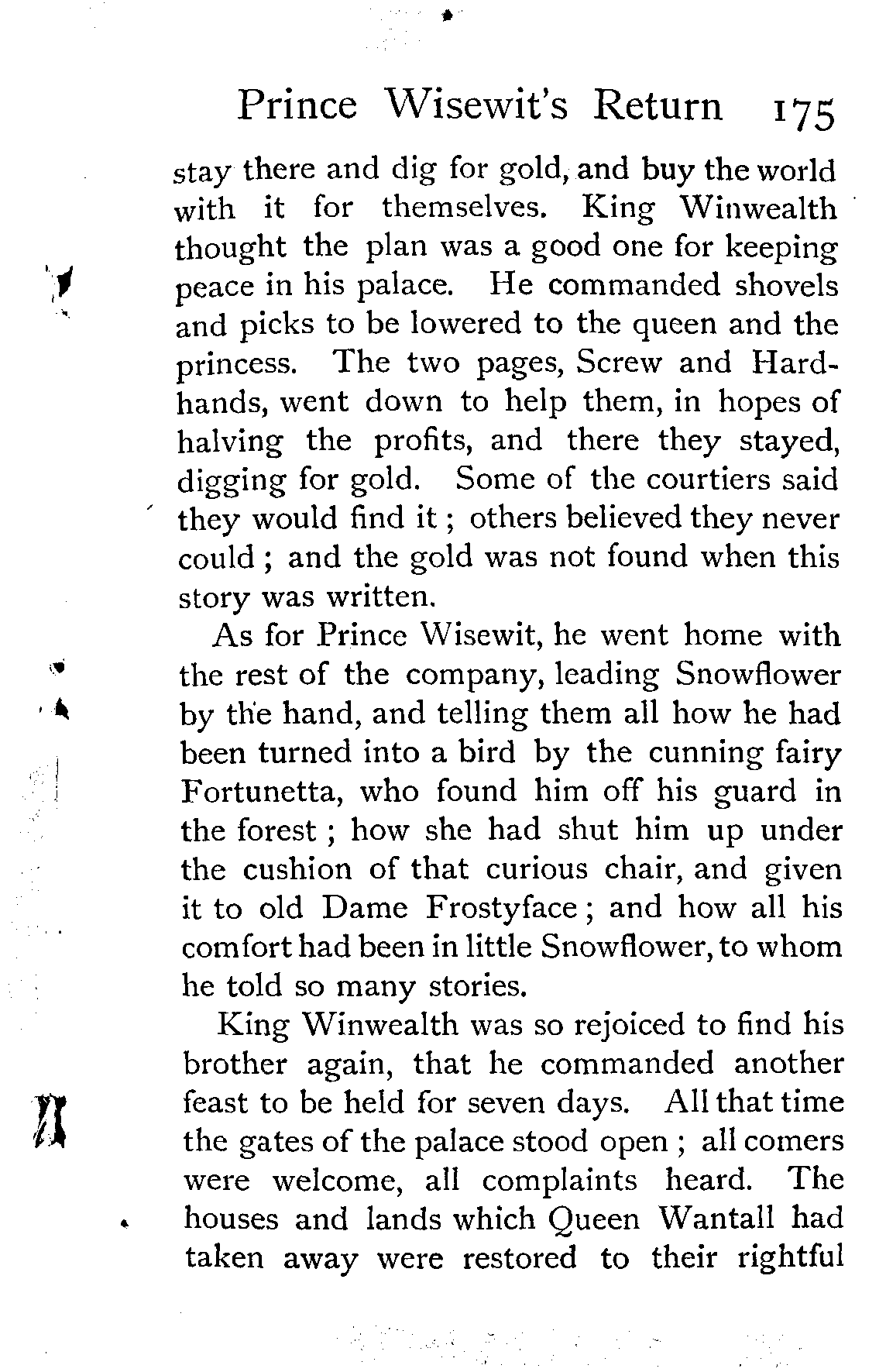 They called the miners false knaves, lazy rogues, and a score of bad names beside, for leaving so much wealth behind them, and utterly refused to come out of the pit; saying, that since Prince Wisewit was come, they could find no pleasure in the palace, but would [Pg 175]stay there and dig for gold, and buy the world with it for themselves. King Winwealth thought the plan was a good one for keeping peace in his palace. He commanded shovels and picks to be lowered to the queen and the princess. The two pages, Screw and Hardhands, went down to help them, in hopes of halving the profits, and there they stayed, digging for gold. Some of the courtiers said they would find it; others believed they never could; and the gold was not found when this story was written.