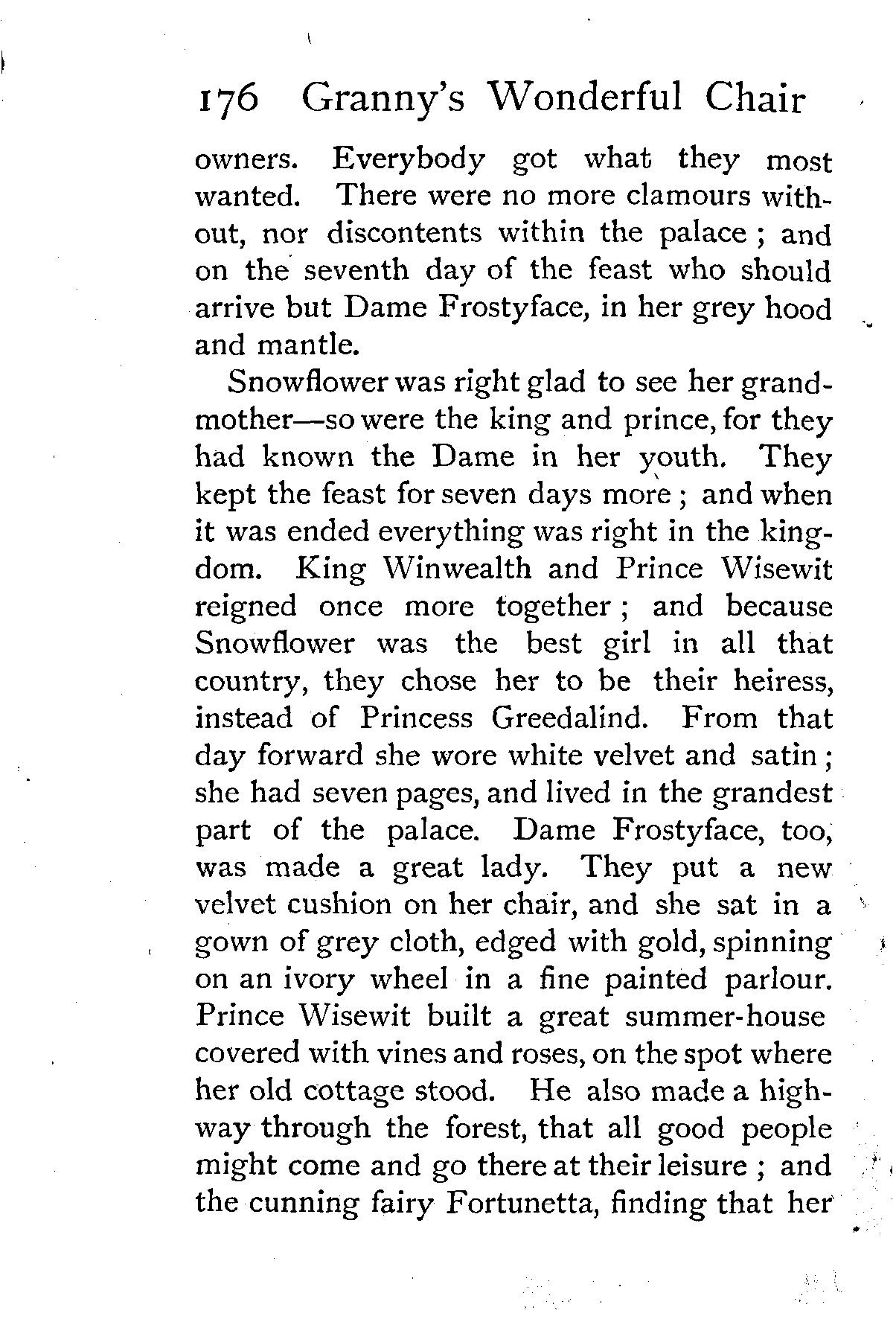 Snowflower was right glad to see her grandmother—so were the king and prince, for they had known the Dame in her youth. They kept the feast for seven days more; and when it was ended everything was right in the kingdom. King Winwealth and Prince Wisewit reigned once more together; and because Snowflower was the best girl in all that country, they chose her to be their heiress, instead of Princess Greedalind. From that day forward she wore white velvet and satin; she had seven pages, and lived in the grandest part of the palace. Dame Frostyface, too, was made a great lady. They put a new velvet cushion on her chair, and she sat in a gown of grey cloth, edged with gold, spinning on an ivory wheel in a fine painted parlour. Prince Wisewit built a great summer-house covered with vines and roses, on the spot where her old cottage stood. He also made a highway through the forest, that all good people might come and go there at their leisure; and the cunning fairy Fortunetta, finding that her [Pg 177]reign was over in those parts, set off on a journey round the world, and did not return in the time of this story. Good boys and girls, who may chance to read it, that time is long ago. Great wars, work, and learning, have passed over the world since then, and altered all its fashions. Kings make no seven-day feasts for all comers now. Queens and princesses, however greedy, do not mine for gold. Chairs tell no tales. Wells work no wonders; and there are no such doings on hills and forests, for the fairies dance no more. Some say it was the hum of schools—some think it was the din of factories that frightened them; but nobody has been known to have seen them for many a year, except, it is said, one Hans Christian Andersen, in Denmark, whose tales of the fairies are so good that they must have been heard from themselves.
