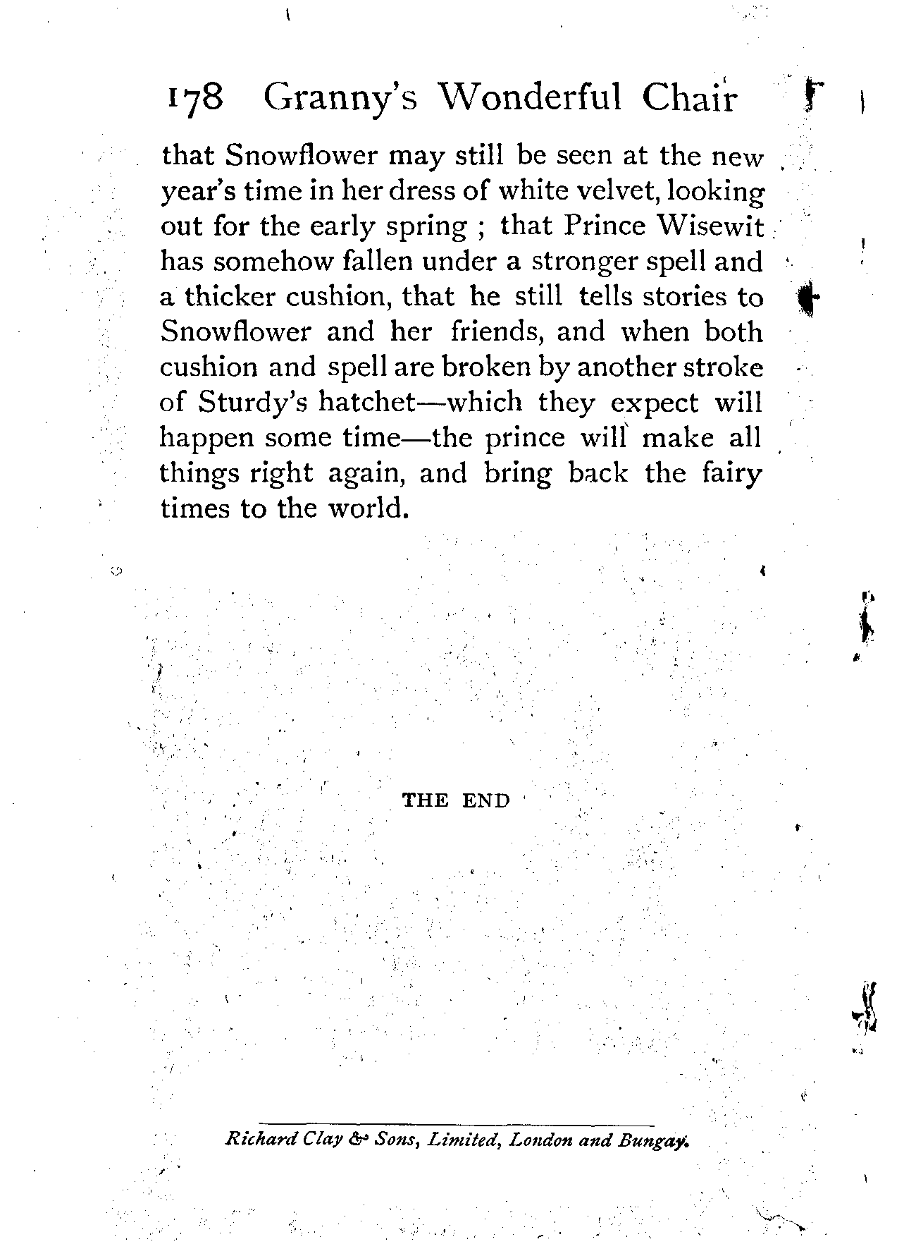 It is certain that no living man knows the subsequent history of King Winwealth's country, nor what became of all the notable characters who lived and visited at his palace. Yet there are people who believe that the monarch still falls asleep on his throne, and into low spirits after supper; that Queen Wantall and Princess Greedalind have found the gold, and begun to buy; that Dame Frostyface yet spins—they cannot tell where; [Pg 178]that Snowflower may still be seen at the new year's time in her dress of white velvet, looking out for the early spring; that Prince Wisewit has somehow fallen under a stronger spell and a thicker cushion, that he still tells stories to Snowflower and her friends, and when both cushion and spell are broken by another stroke of Sturdy's hatchet—which they expect will happen some time—the prince will make all things right again, and bring back the fairy times to the world.