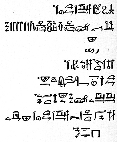 [20]The first five lines of a Papyrus (containing 75 lines), being the beginning of an ancient hymn addressed to the Deity, are added in the original Hieratic, with the transcription in Hieroglyphic characters. The Hieratic is read from right to left, the Hieroglyphic from left to right. The dots in the middle or end of the lines, written in red ink in the original manuscript, indicate that this is a poetic composition.