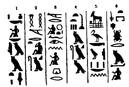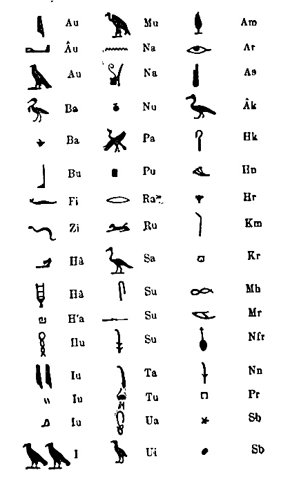 As Champollion made use of his hieroglyphic alphabet for the spelling of other words than proper names, his satisfaction may be imagined when he found that these were Coptic words. Thus, the sign for “mouth” for the letter R, was the initial letter or syllabic sign of the Coptic word Ro, signifying mouth. The picture of a lion for the letter L also represented the initial letter or initial syllable of Lavo, the Coptic for lion. The picture of an eagle, representing the sign for the letter A, is also the sign for the initial sound or letter in Ahem, the Coptic for eagle, and so on.