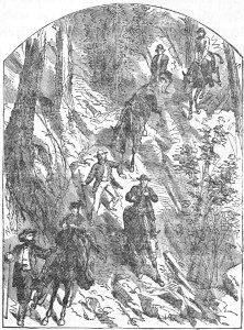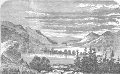 Their well-understood peculiarities did not make them the less welcome at Vancouver. When the cry was given—"the Brigade! the Brigade!"—there was a general rush to the river's bank to witness the spectacle. In advance came the chief-trader's barge, with the company's flag at the bow, and the cross of St. George at the stern: the fleet as many abreast as the turnings of the river allowed. With strong and skillful strokes the boatmen governed their richly laden boats, keeping them in line, and at the same time singing in chorus a loud and not unmusical hunting or boating song. The gay ribbons and feathers with which the singers were bedecked took nothing from the picturesqueness of their appearance. The broad, full river, sparkling in the sunlight, gemmed with emerald islands, and bordered with a rich growth of flowering shrubbery; the smiling plain surrounding the Fort; the distant mountains, where glittered the sentinel Mt. Hood, all came gracefully into the picture, and seemed to furnish a fitting back-ground and middle distance for the bright bit of coloring given by the moving life in the scene. As with a skillful sweep the brigade touched the bank, and the traders and men sprang on shore, the first cheer which had welcomed their appearance was heartily repeated, while a gay clamor of questions and answers followed.