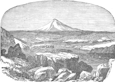 The site chosen by the North-West Company in 1821, for their new fort, combined all these advantages, and the further one of having been already commenced and named. Fort Vancouver became at once on the accession of the Hudson's Bay Company, the metropolis of the northwest coast, the center of the fur trade, and the seat of government for that immense territory, over which roamed the hunters and trappers in the employ of that powerful corporation. This post was situated on the edge of a beautiful sloping plain on the northern bank of the Columbia, about six miles above the upper mouth of the Wallamet. At this point the Columbia spreads to a great width, and is divided on the south side into bayous by long sandy islands, covered with oak, ash, and cotton-wood trees, making the noble river more attractive still by adding the charm of curiosity concerning its actual breadth to its natural and ordinary[Pg 25] magnificence. Back of the fort the land rose gently, covered with forests of fir; and away to the east swelled the foot-hills of the Cascade range, then the mountains themselves, draped in filmy azure, and over-topped five thousand feet by the snowy cone of Mt. Hood.