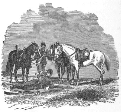 "Custer was passionately addicted to active and exciting sports as the turf and hunting. He was a splendid horseman and a lover of the horse; he attended many American race-meetings and ran his own horses several times in the West. His greyhounds and staghounds went with him at the head of his regiment, to be let slip at antelope or buffalo. With rifle or shotgun he was equally expert, and had killed his grizzly bear in the most approved fashion. * * * Bold to rashness; feverish in camp, but cool in action; with the personal vanity of a carpet knight, and the endurance and insensibility to fatigue of the hardiest and boldest rough rider; a prince of scouts; a chief of guides, threading a trackless prairie with unerring eye of a native and the precision of the needle to the star; by no means a martinet, his men were led by the golden chain of love, admiration and confidence. He had the proverbial assurance of a hussar,[Pg 137] but his personal appearance varied with occasion. During the war he was 'Custer of the golden locks, his broad sombrero turned up from his hard-bronzed face, the ends of his crimson cravat floating over his shoulder, gold galore spangling his jacket sleeves, a pistol in his boot, jangling spurs on his heels, and a ponderous claymore swinging at his side.' And long after, when he roamed a great Indian fighter on the Plains, the portrait was only slightly changed. The cavalry jacket was exchanged for the full suit of buckskin, beautifully embroidered by Indian maidens; across his saddle rested a modern sporting rifle, and at his horse's feet demurely walked hounds of unmixed breed. Again, within a few months, he appears in private society as an honored guest; scrupulously avoiding anything like display, but in a quiet conventional suit of blue, with the 'golden locks' closely shorn, and the bronzed face pale from recent indisposition, he moves almost unnoticed in the throng."