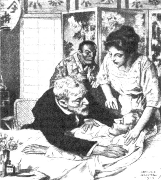 By daily visits Kobu kept himself advised of the patient's condition, and kept us informed of the swift approach of the Vancouver steamer and its dreaded passenger. One day, when Page was sleeping and our anxiety as to what was coming had reached the breaking point, the detective came. He announced that he had received information that the steamer had docked at Yokohama that morning. In the afternoon the Chicago Bank representative would arrive at Otsu, our nearest railroad station. Kobu said he would bring the guest to our house at once and his kind wish that Page San's "sicker would soon be healthy" did not wholly hide the triumph of his professional pride.