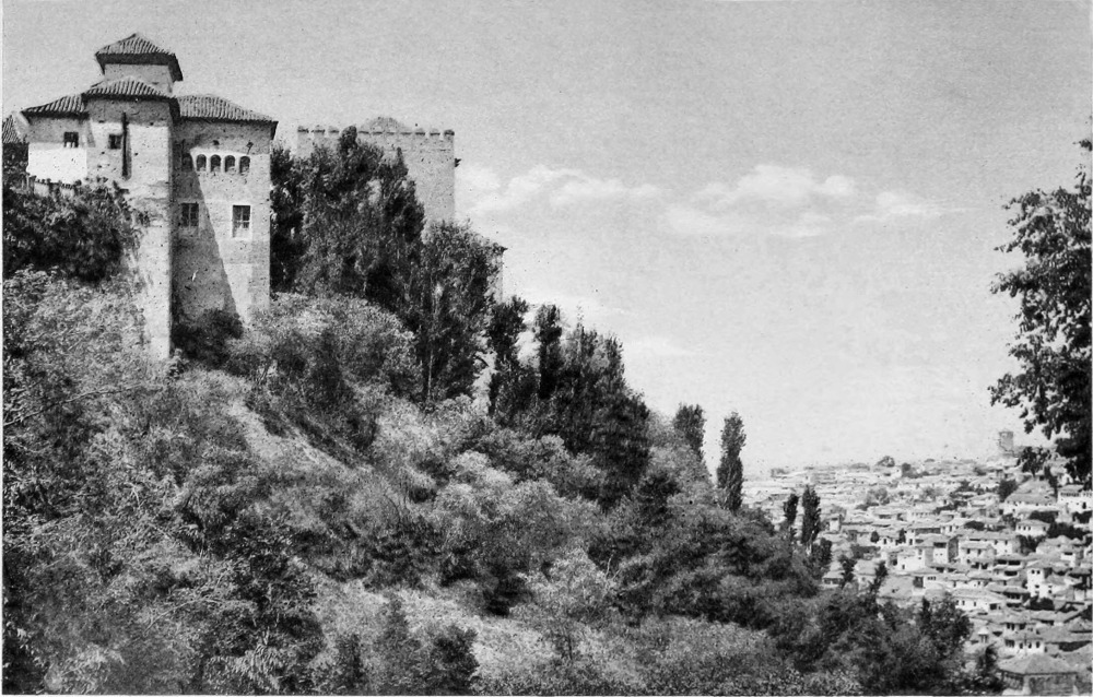 On the 23d November (el dia de San Clemente) the strong fortress of the Alcazar is stormed and Azataff capitulates. Then, amid an inaudible blare of trumpets and fifes, ringing of bells and beating of drums, King Fernando, in a suit of fine steel armour, a royal crown of wrought gold encircling his casque, and mounted on a graceful Andalusian charger caparisoned with silver housings, enters the gate nearest to the river on the north, from henceforth to be known as “La{335} Puerta del Trionfo.” By his side rides Don Garcia de Varga and his brother Don Diego (whom it is said the immortal Don Quixote de la Mancha chose as his model for tearing up the wild oak-tree, and which act of valour he proposed to perform equally), the Conde Lorenzo, the Lord of Haro, Pelayo Correa, the Master of Santiago, and many other champions of the times.