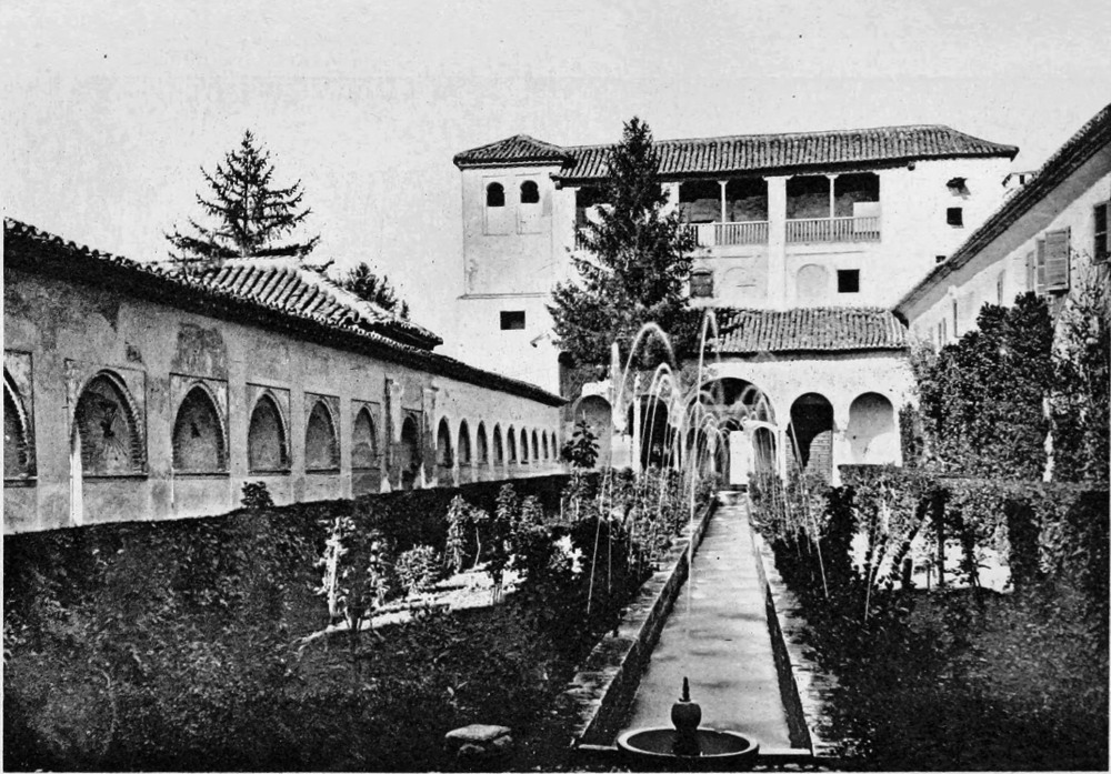 Passing an outer barbican with two low towers the Patio de las Banderas, where floats the flag of Spain, a dark corridor leads to the inner Patio de la Monteria, where the portal of Don Pedro blazes in the sun, a glittering blending of red, blue, and gold, set on snowy surfaces of finest fretwork; painted roofs casting rich shadows, arabesques formed into Cufic letters, diapered borders parting into groups of horseshoe arches, and a Gothic inscription setting forth “that the most high and powerful Don Pedro, by the Grace of God King of Castile and Leon, ordered these castles and fortresses to be re-erected.” The magic of it all is wonderful, coming into sight as{342} it does, rising tier above tier, parapet on parapet, in a glow of Oriental colour, to a central dome cutting against the azure sky; the door a curious mosaic of dark wood, and on either side low marble benches, sunk into the arcaded carvings of the wall, where the young King Don Pedro sat to administer justice to all who came, while his dark-haired mistress, Maria de Padilla, watched from above, leaning out of the central mirador (window) of her chamber, still used as a retiring room for the queens of Spain.